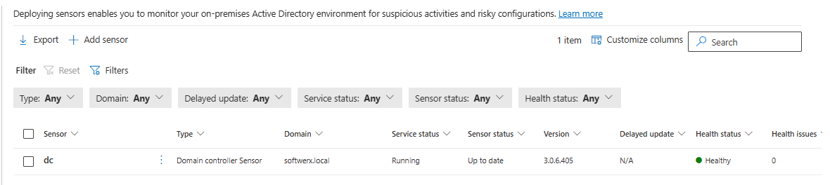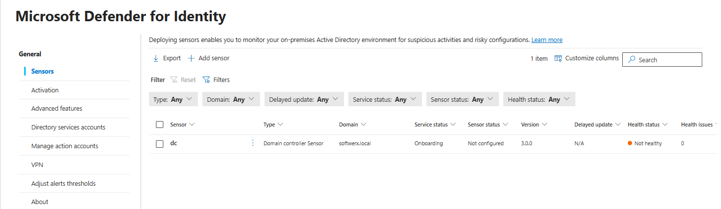 Go to System > Settings > Identities > Sensors. You should see your domain controller listed with status "Running" or "Healthy."