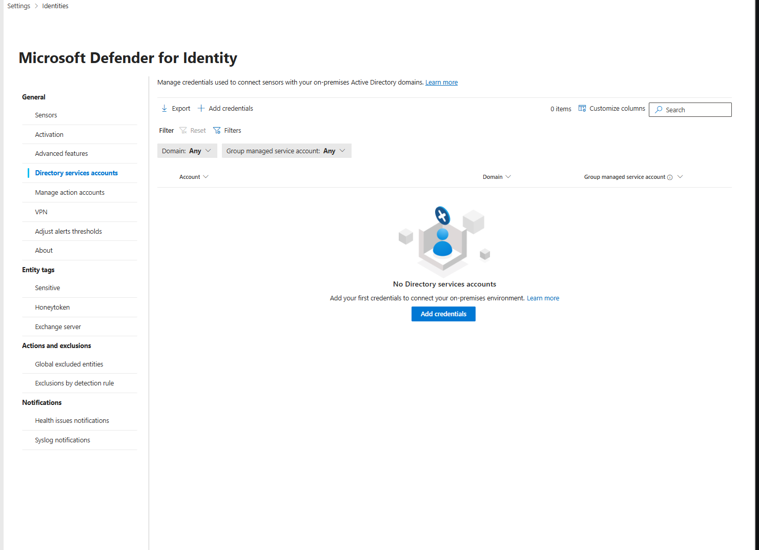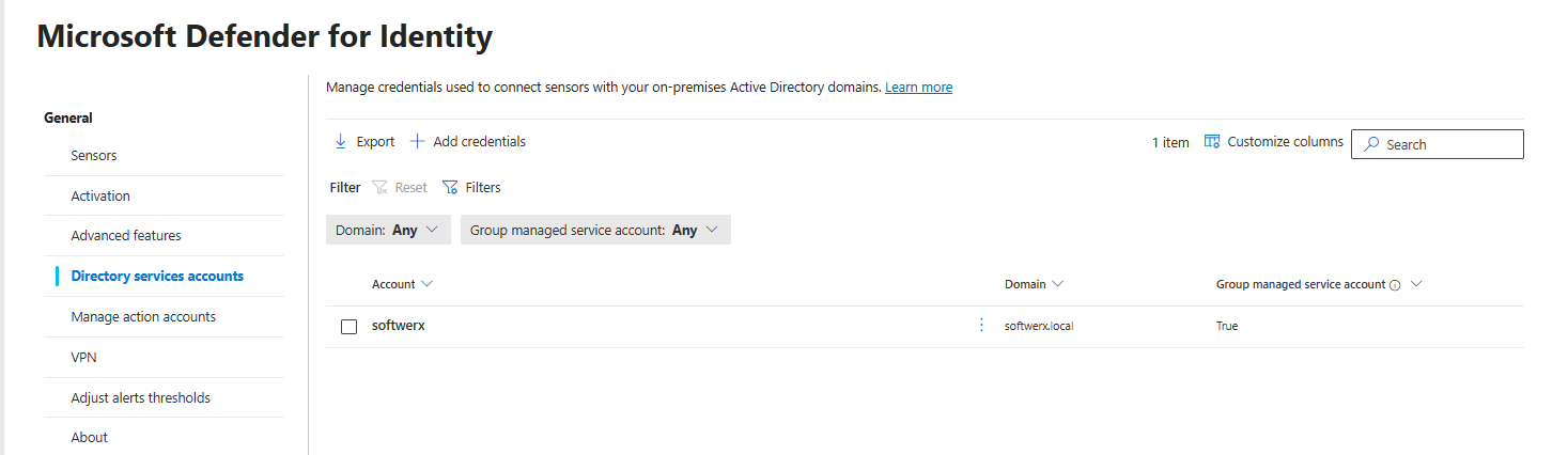 If you want to enable full AD visibility for reconnaissance and account change detection, create a gMSA and configure it at System > Settings > Identities > Directory Service Account. The sensor will use this for queries. This is optional for the new v3.x sensor, but recommended for comprehensive coverage.