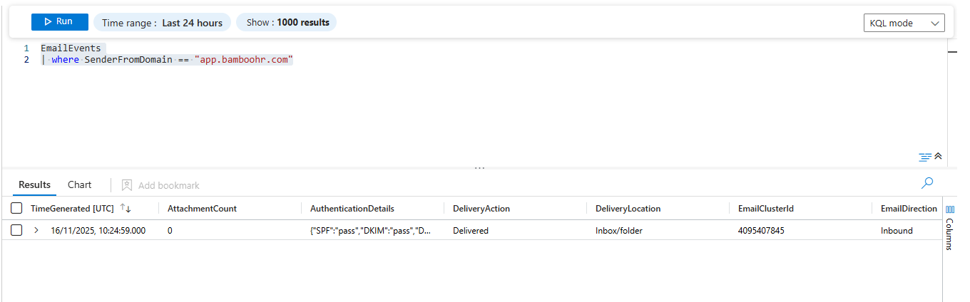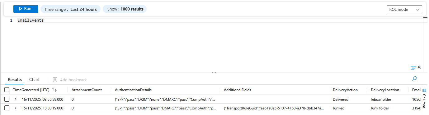 EmailEvents table: Every email that hits your tenant. Sender, recipient, subject, message ID, whether it's internal or external, what policy acted on it, and final verdict. Not just flagged emails. All of them. All queryable.