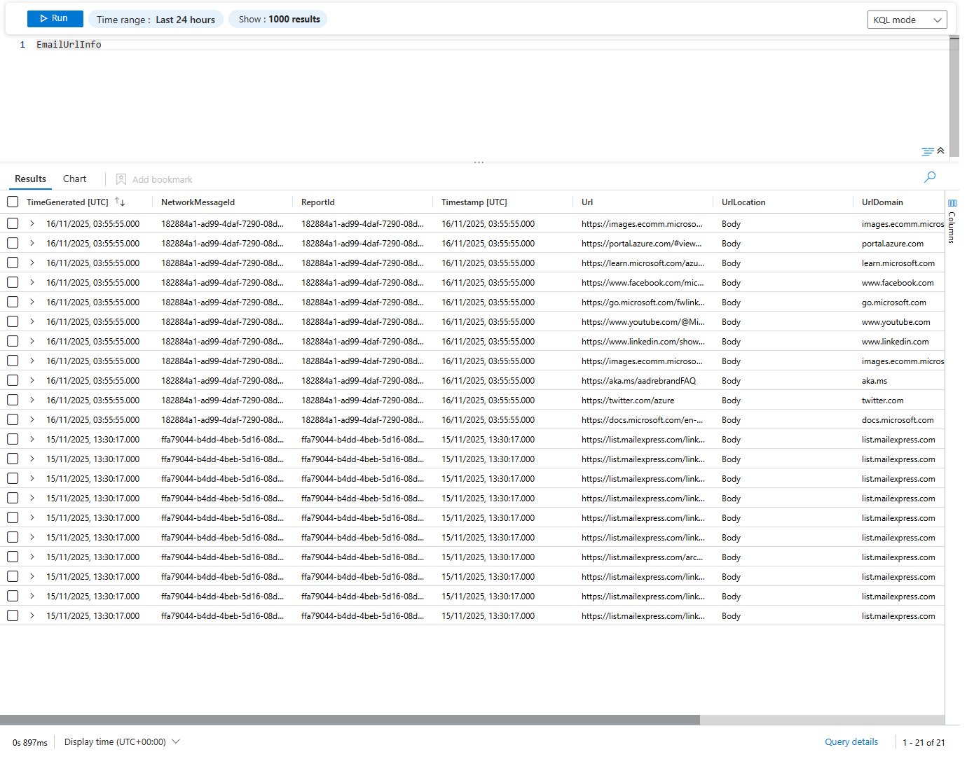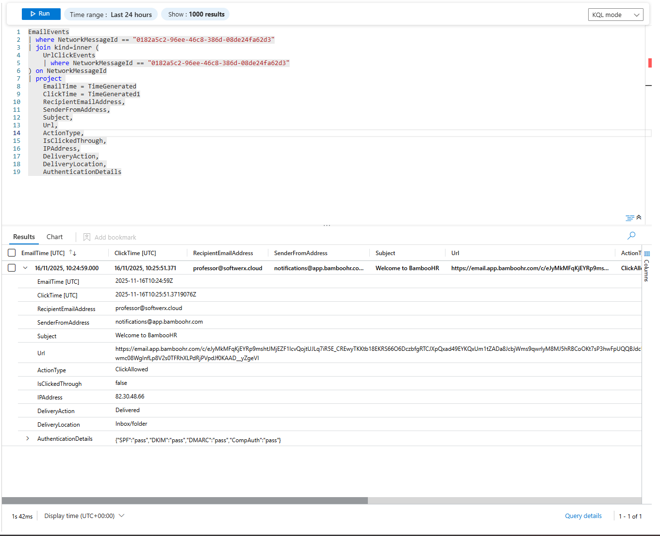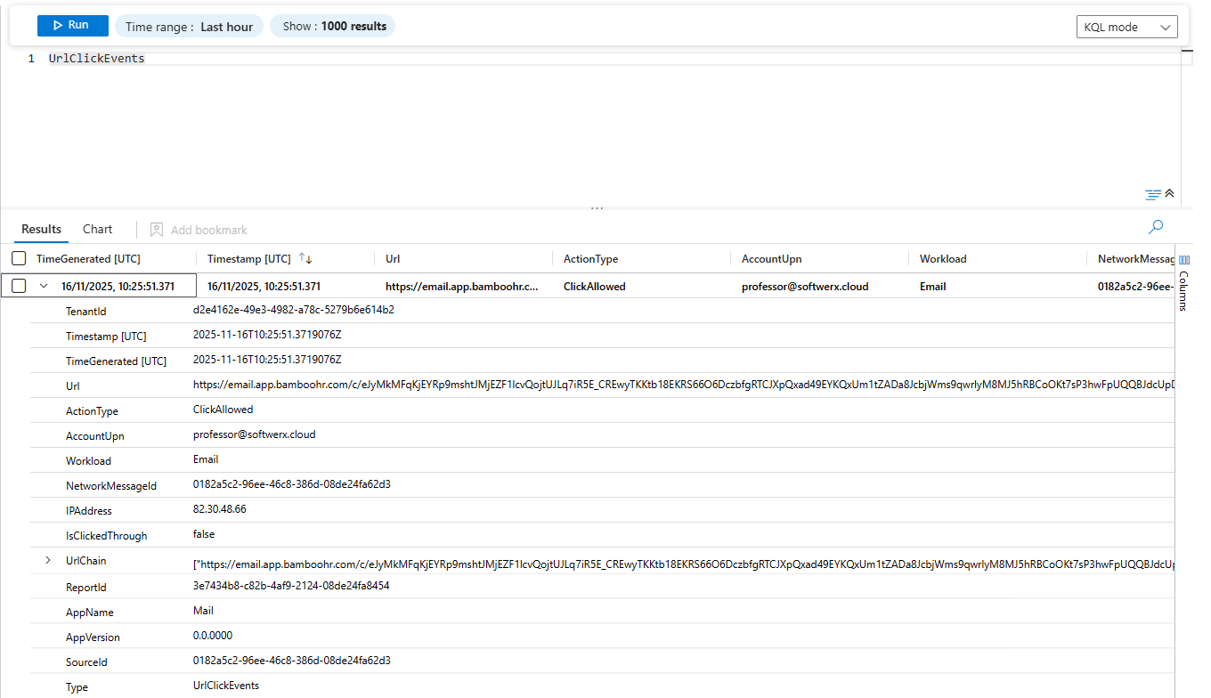 Now join UrlClickEvents with EmailEvents using NetworkMessageId. You get the full email context: sender, recipient, subject, delivery time, all URLs in the email.