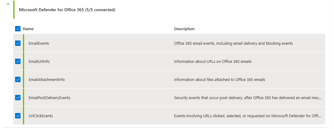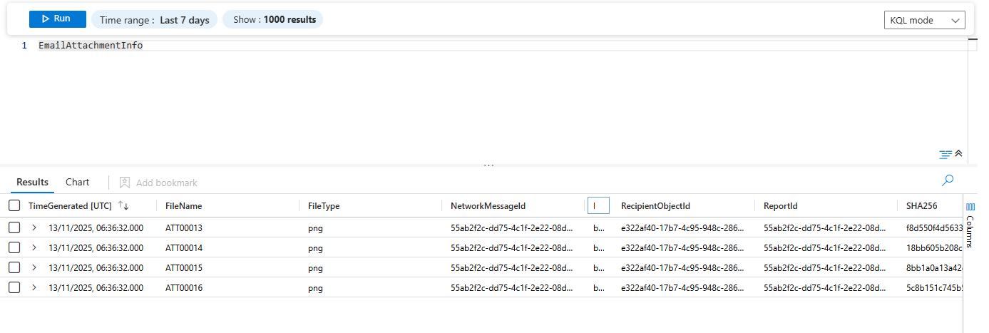 EmailAttachmentInfo: Attachment metadata from every email. Filename, file type, size, and SHA256. Again, all attachments. Not just suspicious ones.