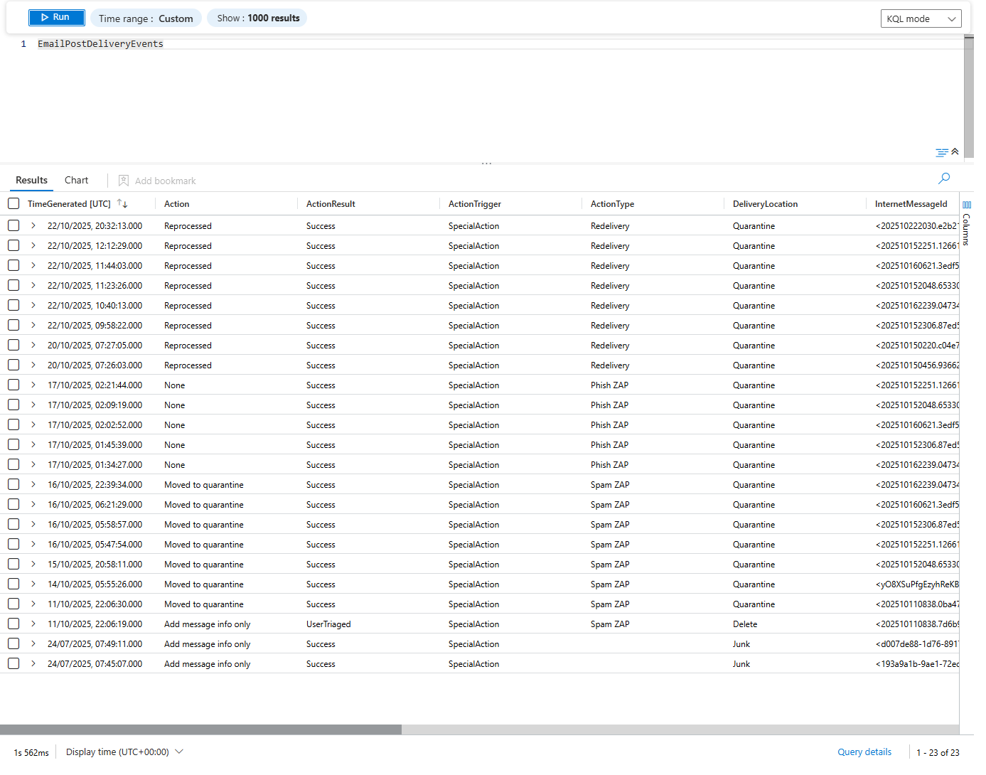EmailPostDeliveryEvents: The forensic table. When ZAP (Zero-hour Auto Purge) retroactively removed an email after delivery. When remediation actions are fired. If a malicious email got through, got delivered, and then you caught and removed it, the entire timeline is in this table.