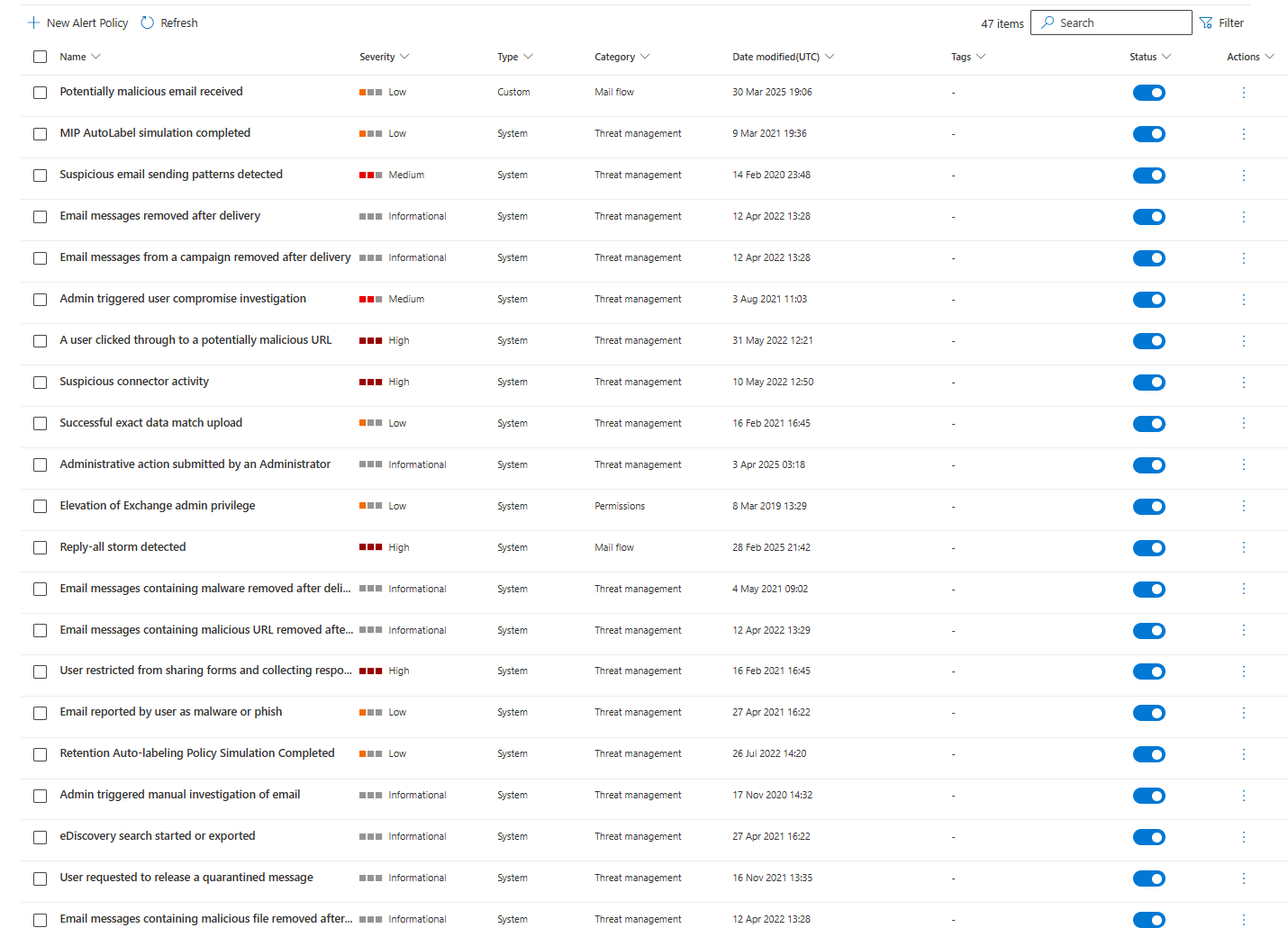 Microsoft ships 47 default alert policies. They're on by default. Most people have no idea they exist.