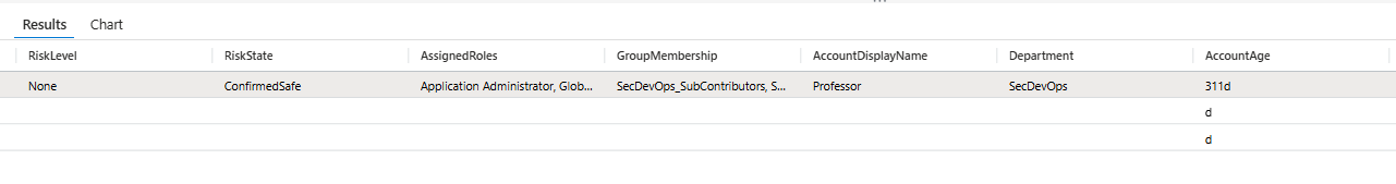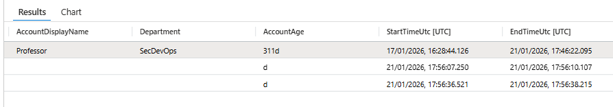 | extend AccountAgeDays = toint((now() - AccountCreationTime) / 1d)A 2-day-old service account deploying is suspicious. A 5-year-old service account deploying is normal. This single field tells you which.