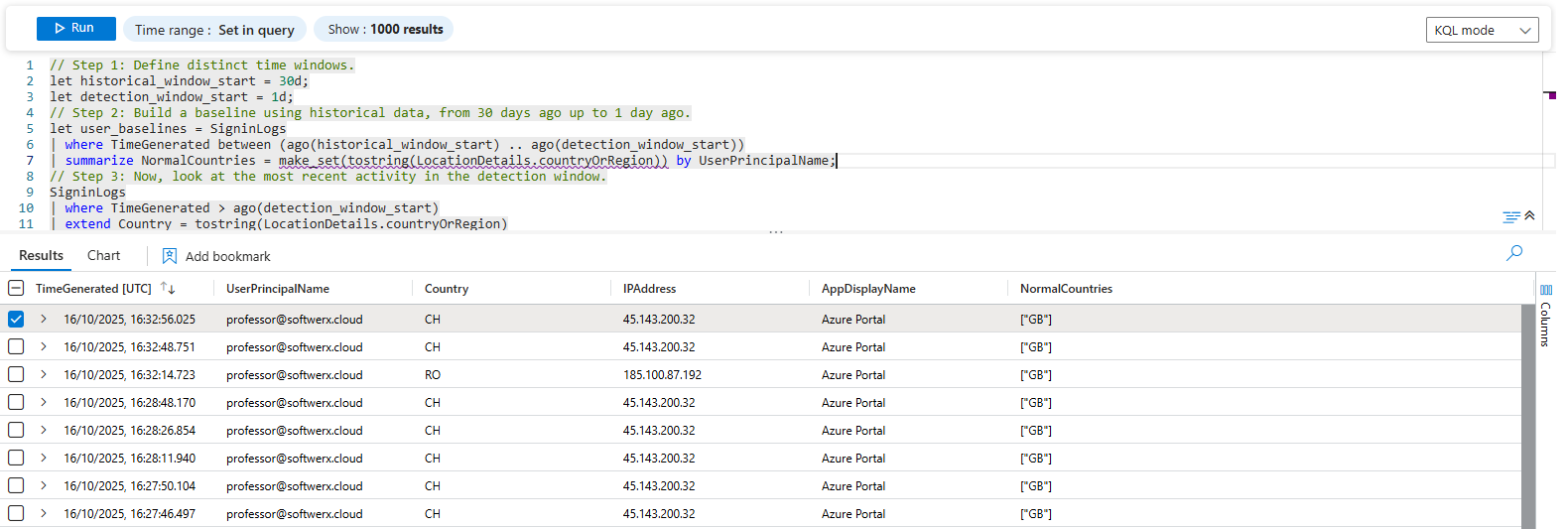 where NormalCountries !contains Countryclause does the work. It compares a recent login from "CH (Switzerland) against the historical baseline of["UK"]. Since "CH" is not in the list, the query flags it as a true anomaly.