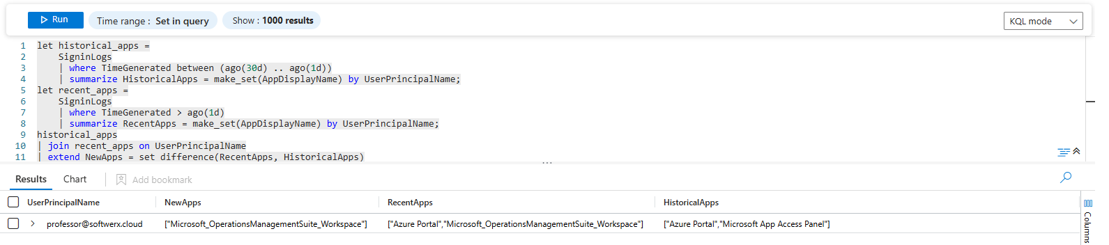 | project UserPrincipalName, NewApps, RecentApps, HistoricalAppsThis is how you build a behavioural analytic: