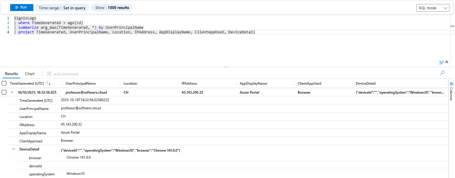 summarize ... by UserPrincipalName: As always, we are grouping all events for each user.arg_max(TimeGenerated, *): This is the magic. In plain English, you're telling KQL: "For each user group, find the single row that has the maximum (most recent)TimeGenerated. Once you've found that specific row, the*tells me you should bring back all (*) the other columns from it."