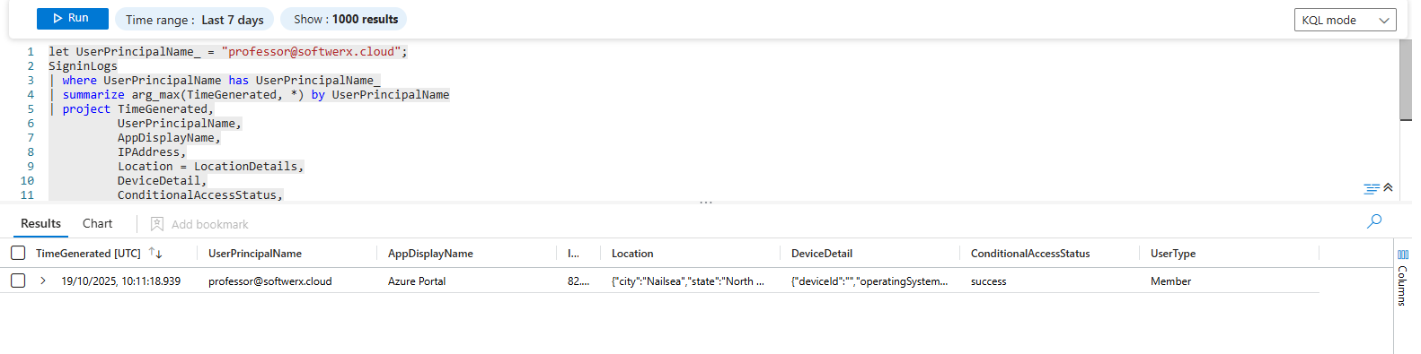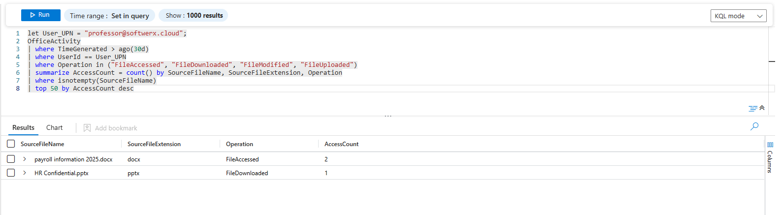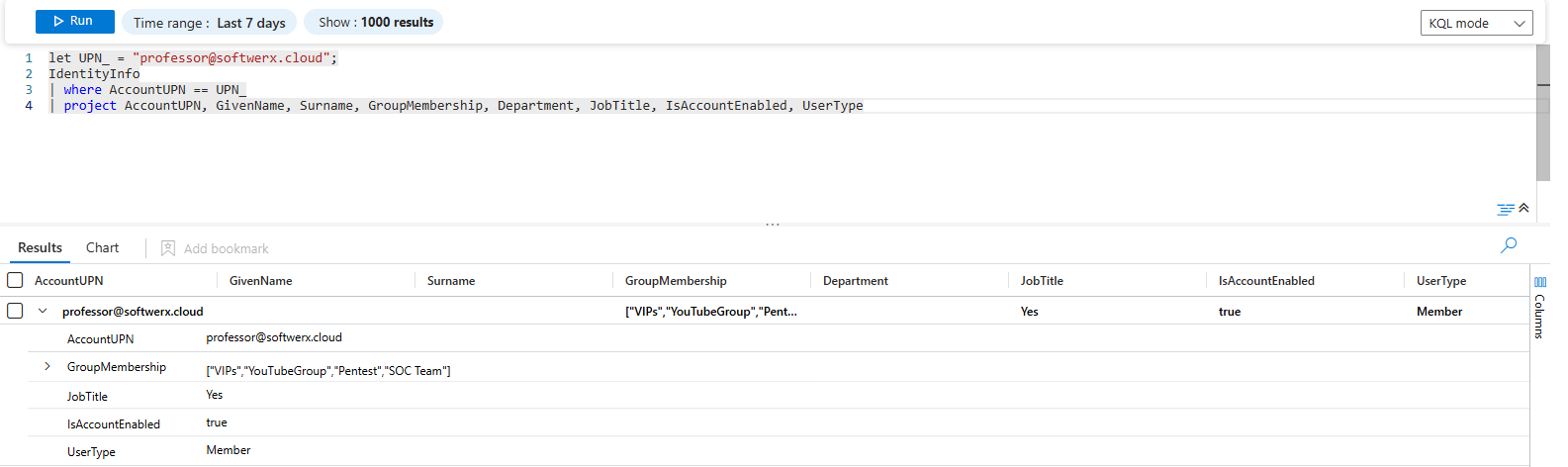 | project AccountUPN, GivenName, Surname, GroupMembership, Department, JobTitle, IsAccountEnabled, UserTypeLet's break it down: This query pulls from IdentityInfo, a summarized table that holds the ground truth from Entra ID. The GroupMembership field is especially valuable. If you see this user accessing financial data later, but they aren't in the "Finance" group, you've already found a major red flag.