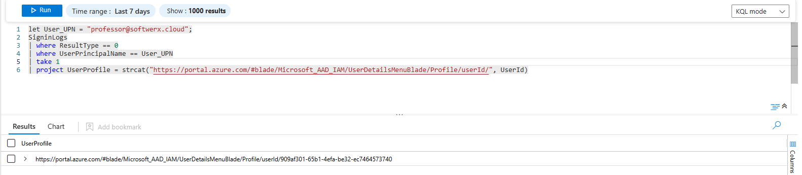 | project UserProfile = strcat("https://portal.azure.com/#blade/Microsoft_AAD_IAM/UserDetailsMenuBlade/Profile/userId/", UserId)Let's break it down: This isn't an analysis query; it's a utility. It grabs just one successful sign-in to find the user's immutable UserId and then uses strcat to build the full URL. Copy the result, paste it into your browser, and you're looking at their live profile.