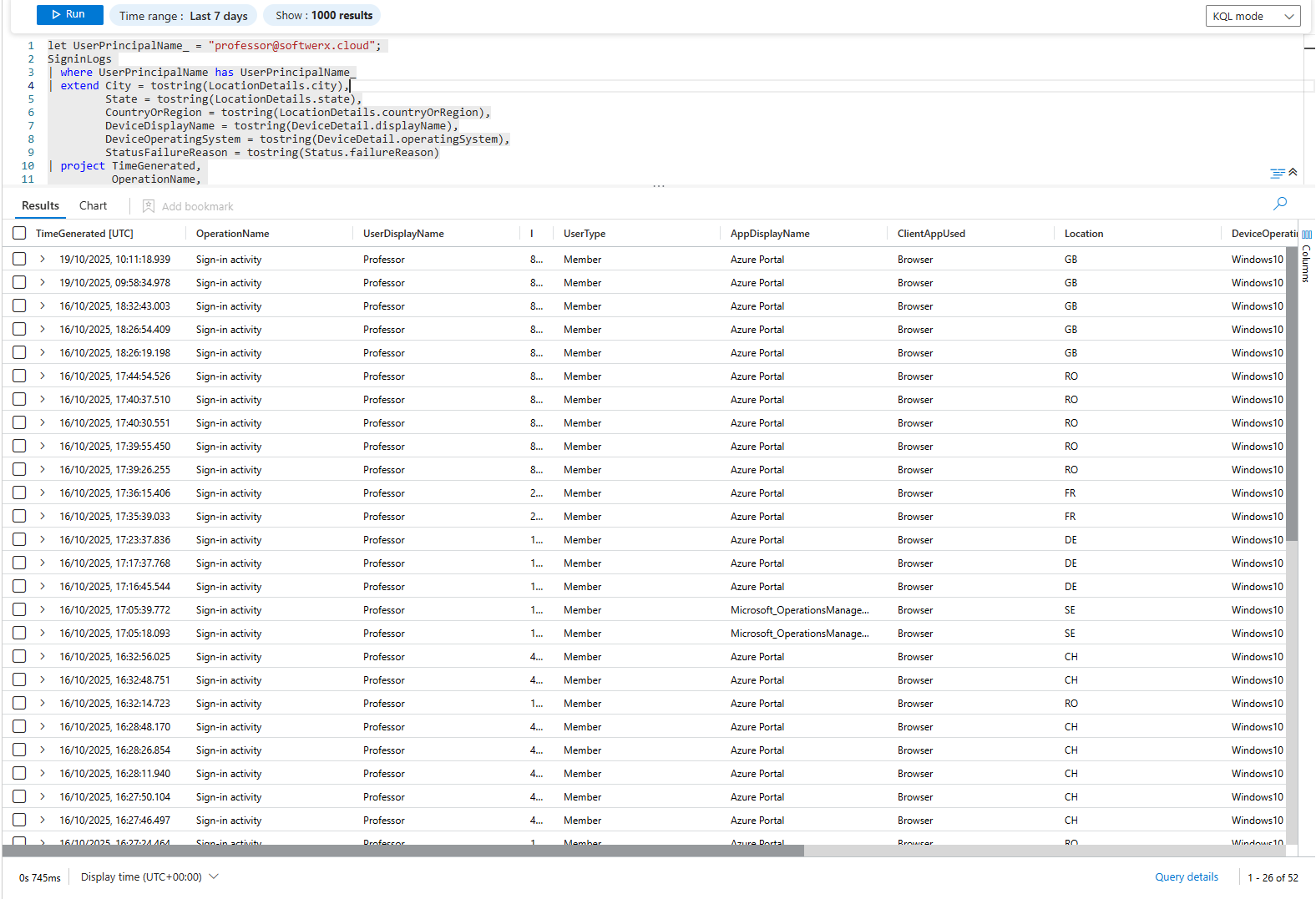 | sort by TimeGenerated descLet's break it down: This query uses extend to crack open the LocationDetails and DeviceDetail JSON blobs, turning messy nested data into filterable columns. It’s the perfect starting point for seeing their locations, devices, and any failed login attempts.