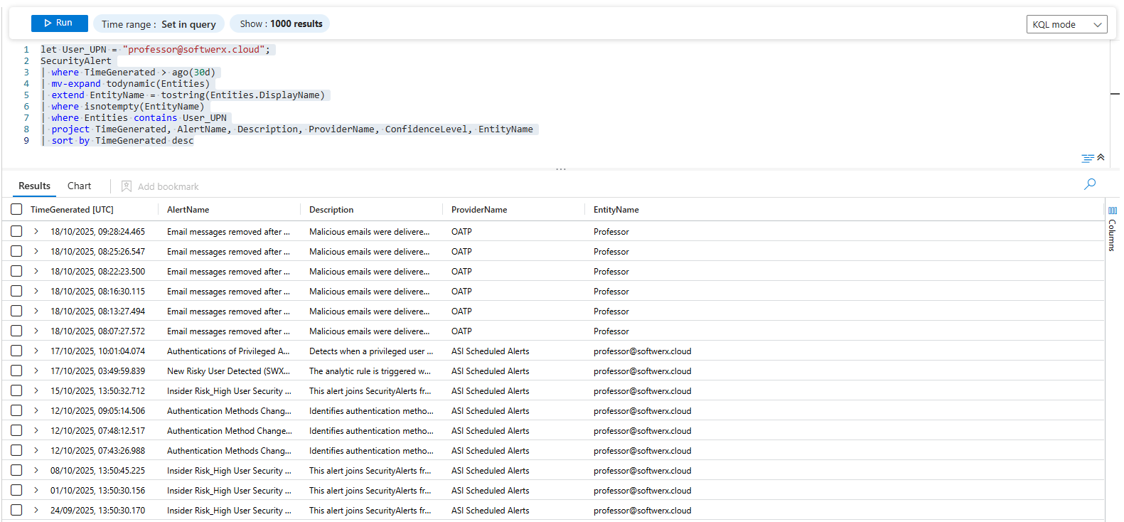 Before you go any further, find out what your security tools already know. Has Sentinel already generated an alert or incident for this user?