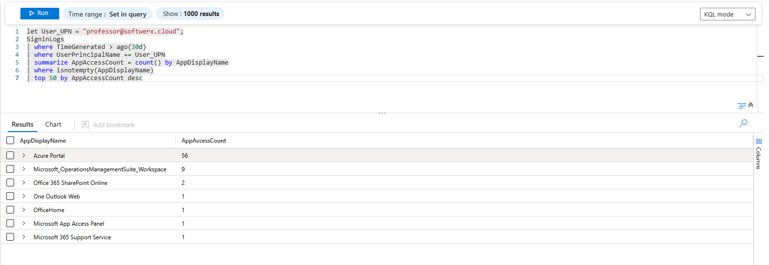 | top 50 by AppAccessCount descLet's break it down: A straightforward but powerful use of summarize and top. This gives you a ranked list of the user's most-used applications, making outliers easy to spot.