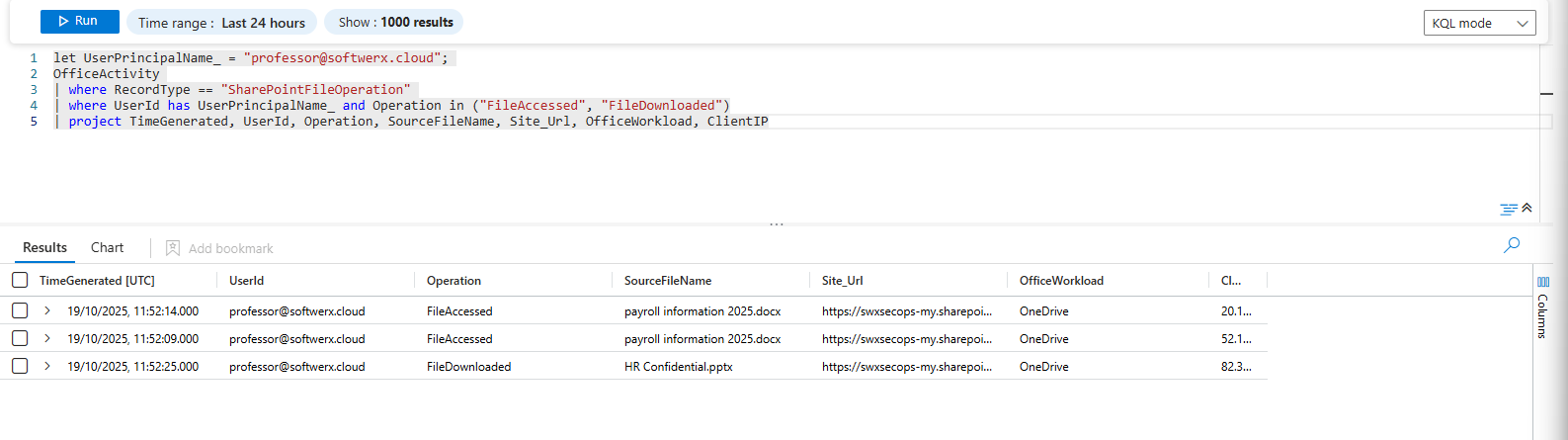 These queries dive into OfficeActivity to see how the user interacted with files in SharePoint and OneDrive.