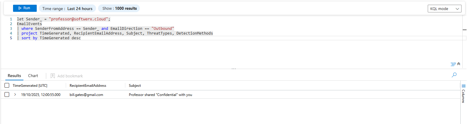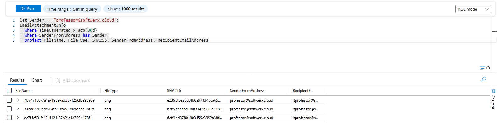 | project FileName, FileType, SHA256, SenderFromAddress, RecipientEmailAddressLet's break it down: The first query gives you a communication log. The second is for forensics; the SHA256 hash is a unique fingerprint you can use to hunt for a malicious attachment across your entire environment.