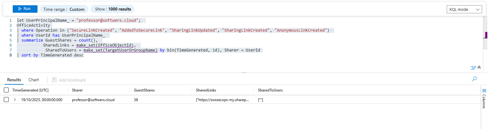SharedToUsers = make_set(TargetUserOrGroupName) by bin(TimeGenerated, 1d), Sharer = UserId
