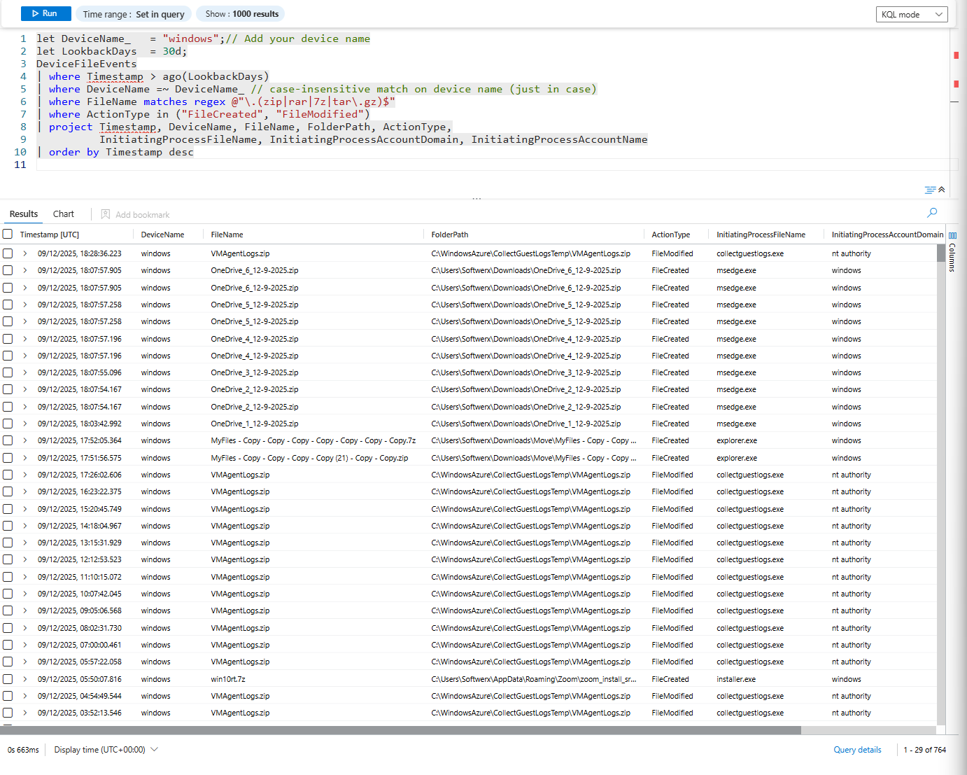 What you're looking for: Archives created in suspicious locations (temp folders, downloads, user home directory). Multiple archives created in a single day. Archives of folders that contain sensitive data (CONFIDENTIAL, IP, FINANCIAL).