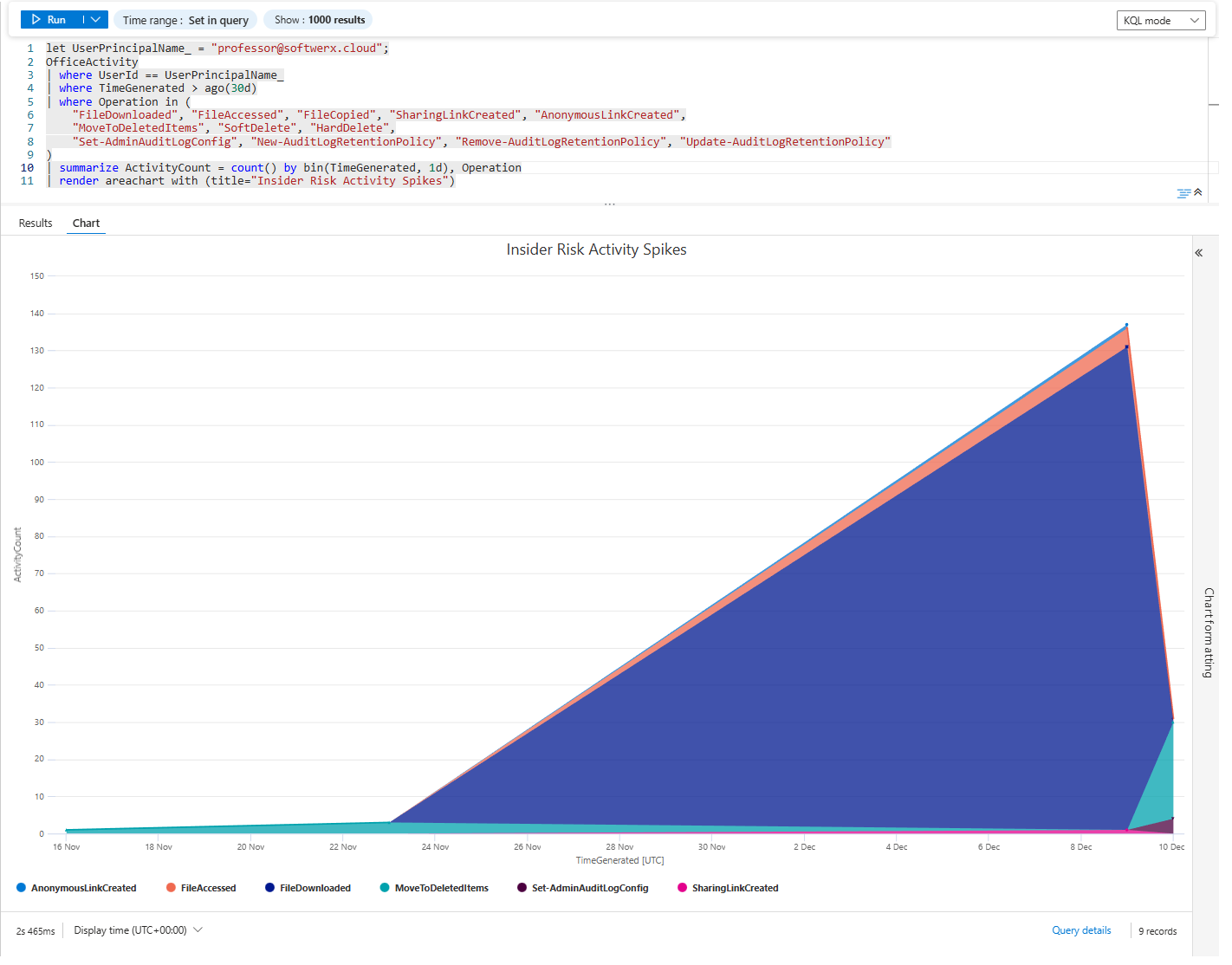 | render areachart with (title="Insider Risk Activity Spikes")What you're looking for: Any spike in suspicious activity in the weeks before departure. Usually it's quite easy to spot those patterns.