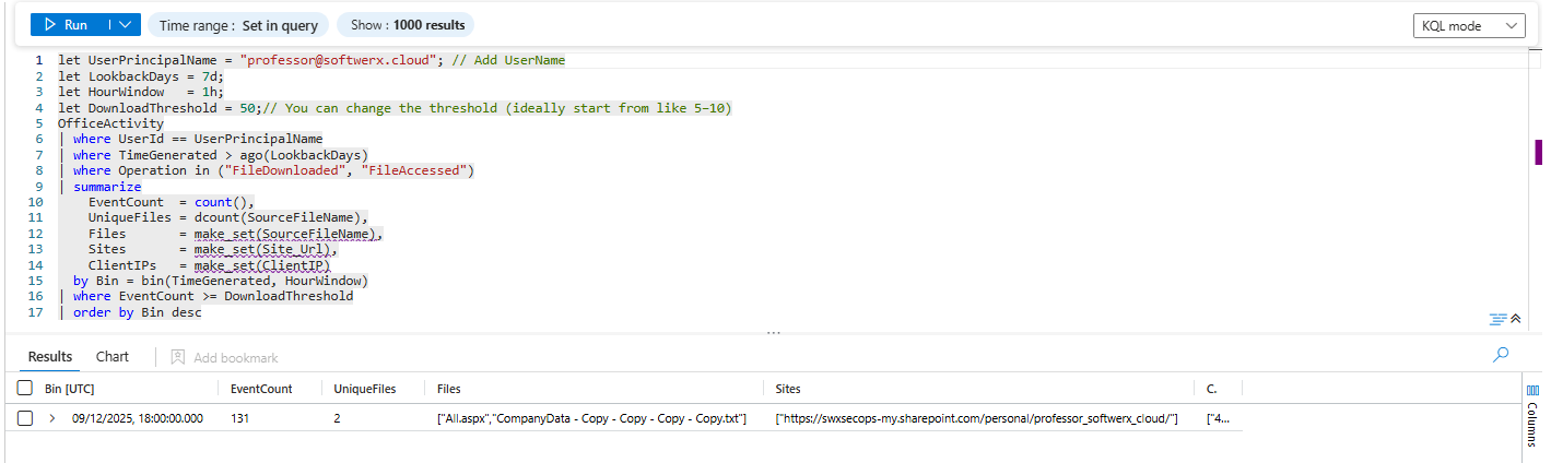 | order by Bin descWhat you're looking for: If someone downloaded 50 files at 2 AM on a Saturday, that's intentional. If they did it right before giving notice, even more so. Legitimate backup operations are scheduled and regular. One-time bulk downloads are suspicious.