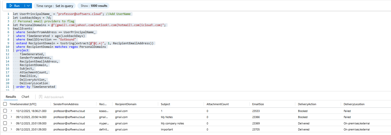 | order by TimeGeneratedWhat you're looking for: Emails to personal Gmail, Yahoo, or Outlook accounts. Multiple emails over time (not just one). Emails with attachments (the actual exfiltration). Subject lines with keywords like "resume," "portfolio," "confidential," "trade secret," and "salary."