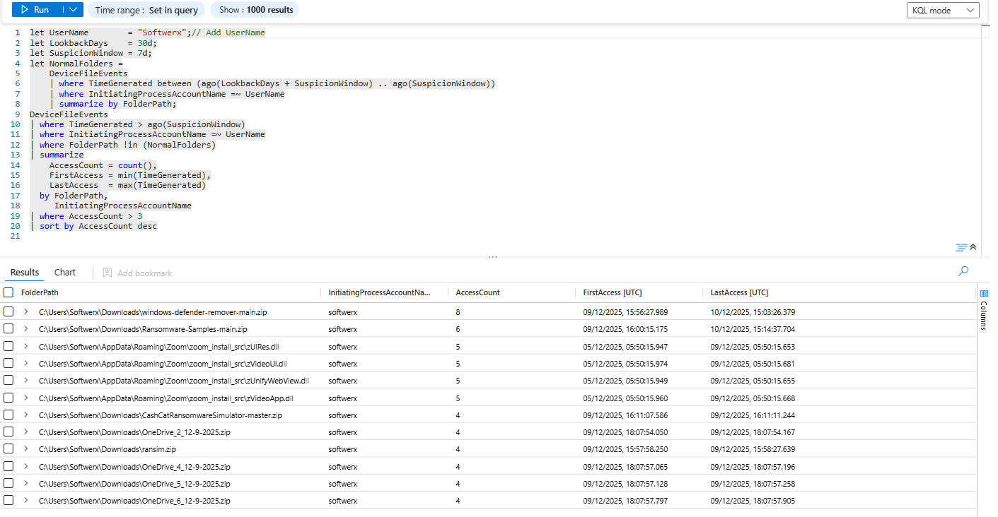 What you’re looking for: folders that never appeared in the user’s history over the last 30 (you can extend it, of course) days but suddenly show multiple accesses in the last couple of days. Finance hammering HR home drives, a dev wandering through Legal or M&A shares, or a random account suddenly crawling “CONFIDENTIAL” folders right before offboarding.
