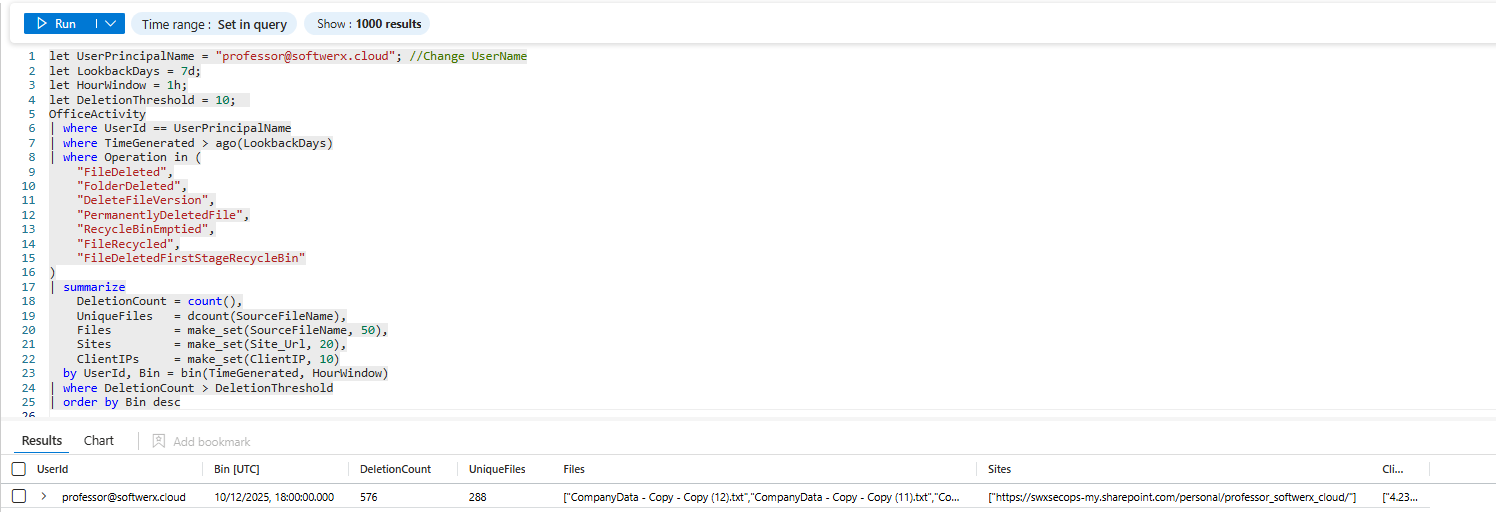 What you're looking for: Spikes in deletion activity. Multiple files deleted in a short time window. Especially critical: deletions right before the user is terminated or resigns.