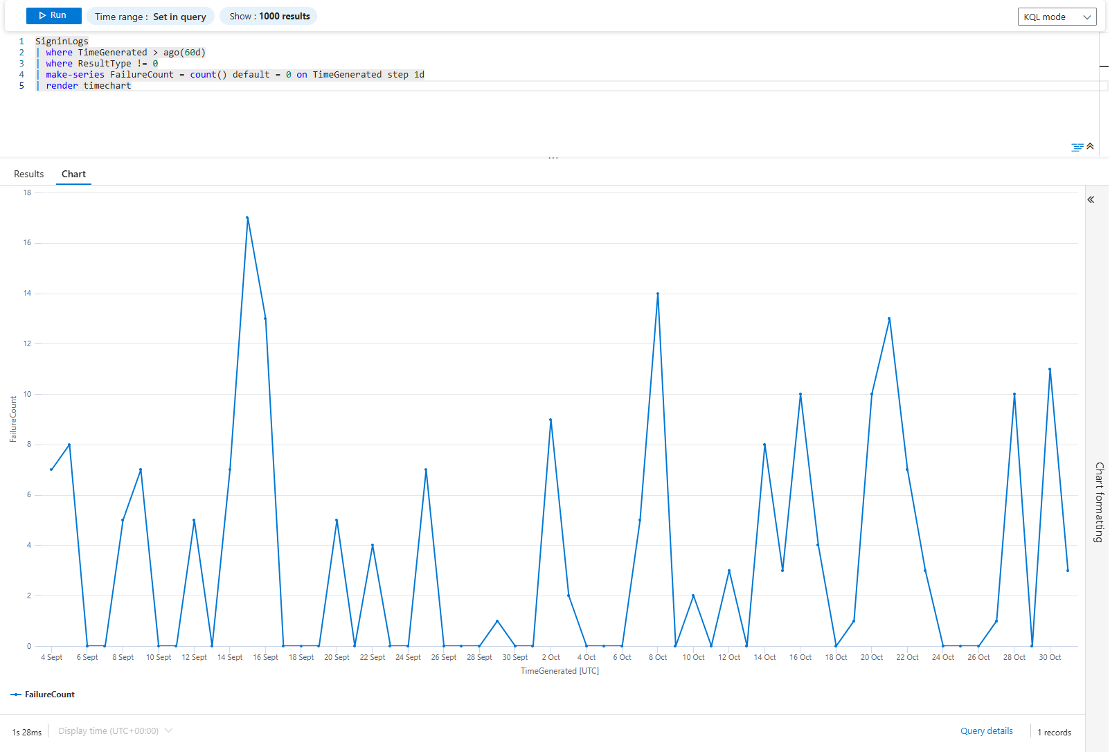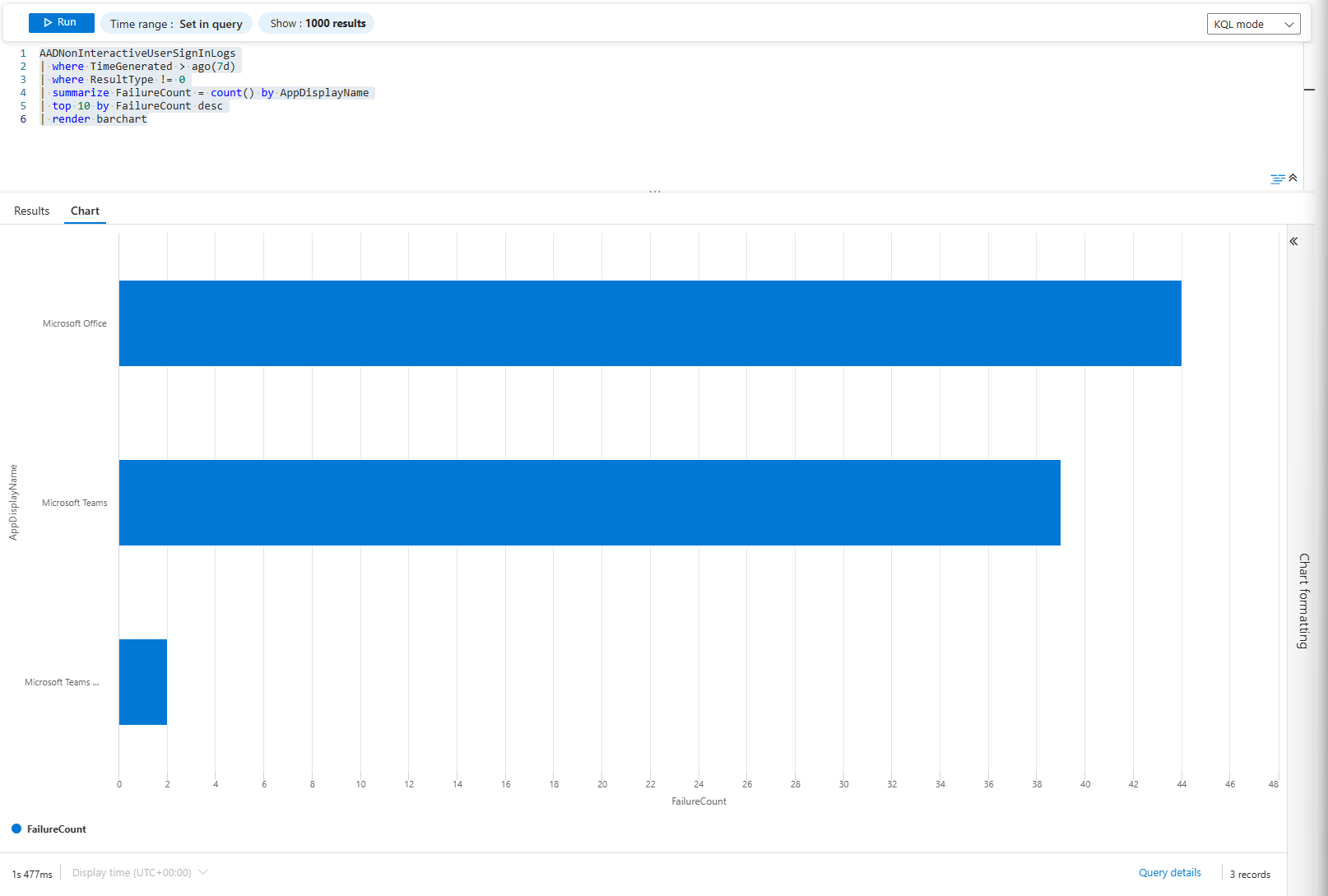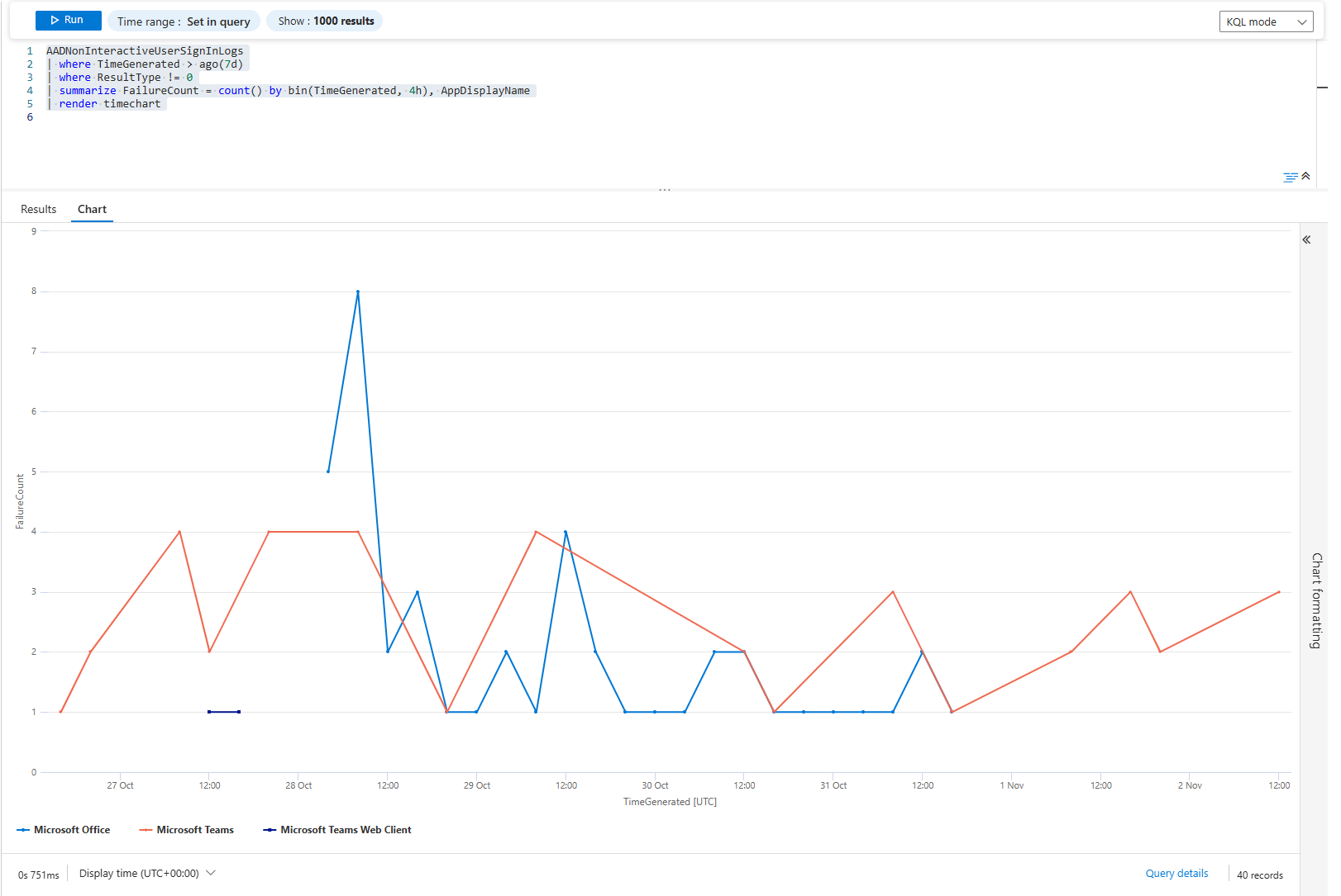 | summarize FailureCount = count() by bin(TimeGenerated, 4h), AppDisplayName