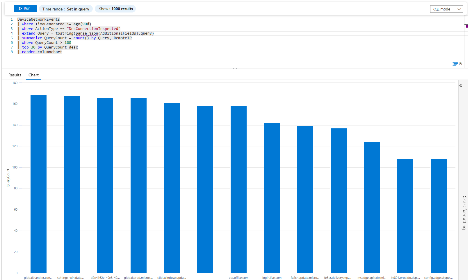 Top 30 DNS domains being queried. Most are legitimate (microsoft.com, google.com, cloudflare.dns). But if you see evil-c2.ru in the top 30 with 5,000 queries, you have a problem.