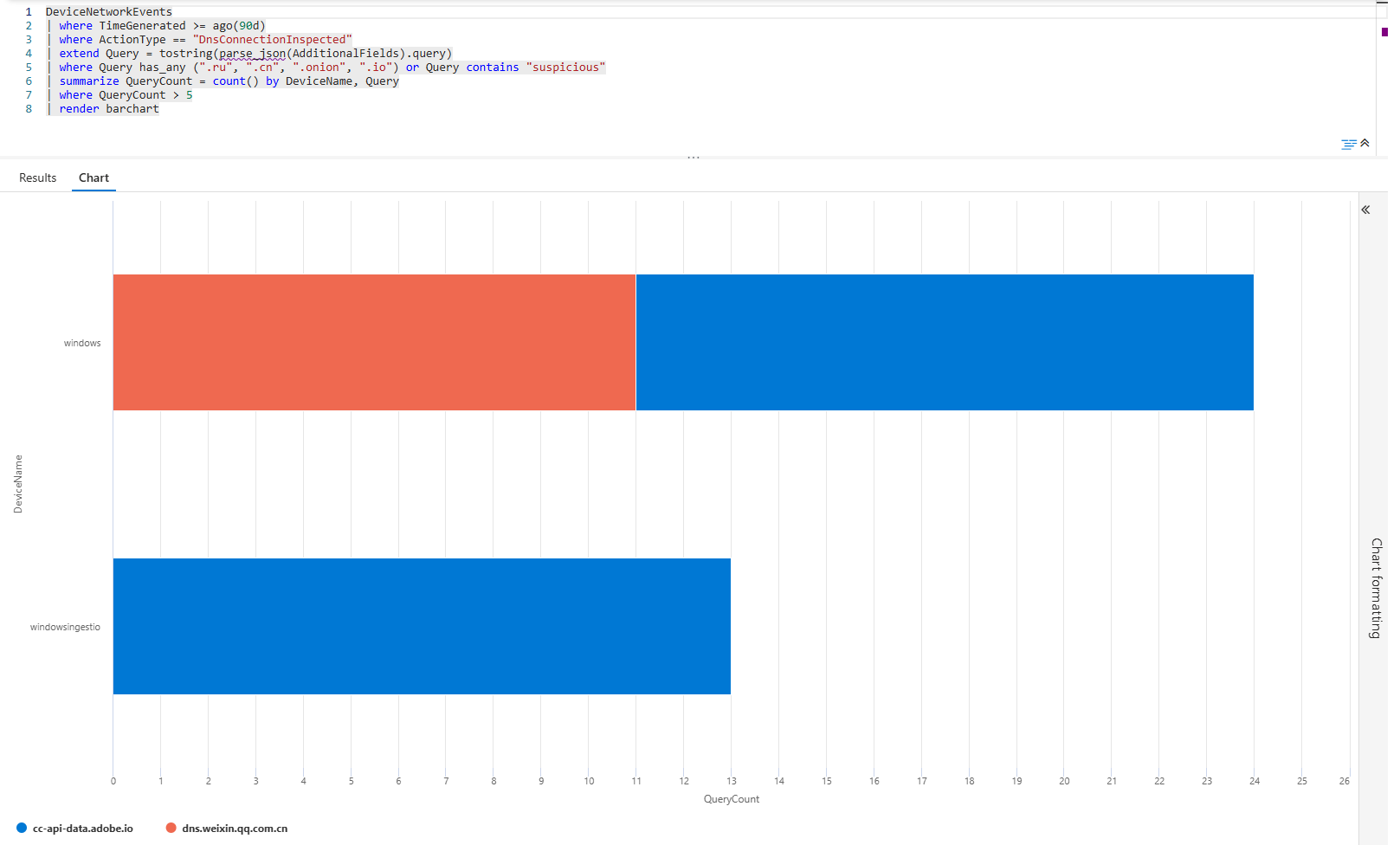 Bar chart of suspicious domain queries by device. Each bar is a device+domain combo. If your finance server is querying TOR domains, that's a compromise. If it's a dev machine, it's probably a dev testing VPN bypassing, but it needs review.