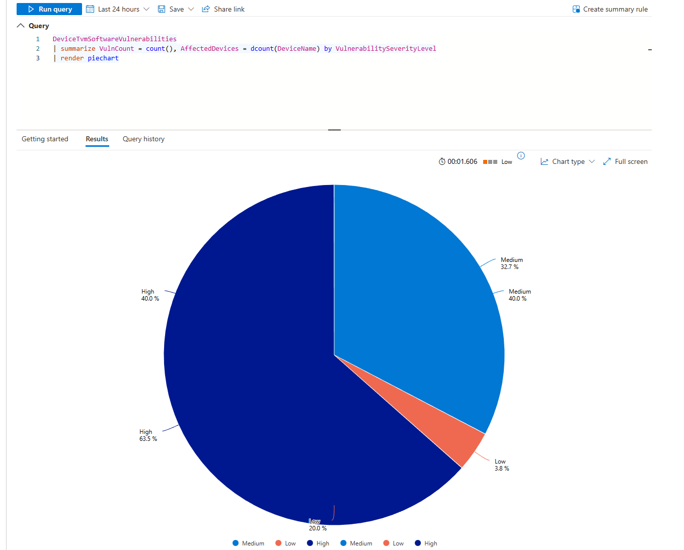 | summarize VulnCount = count(), AffectedDevices = dcount(DeviceName) by VulnerabilitySeverityLevel