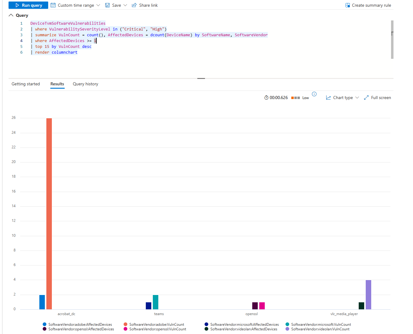 | summarize VulnCount = count(), AffectedDevices = dcount(DeviceName) by SoftwareName, SoftwareVendor