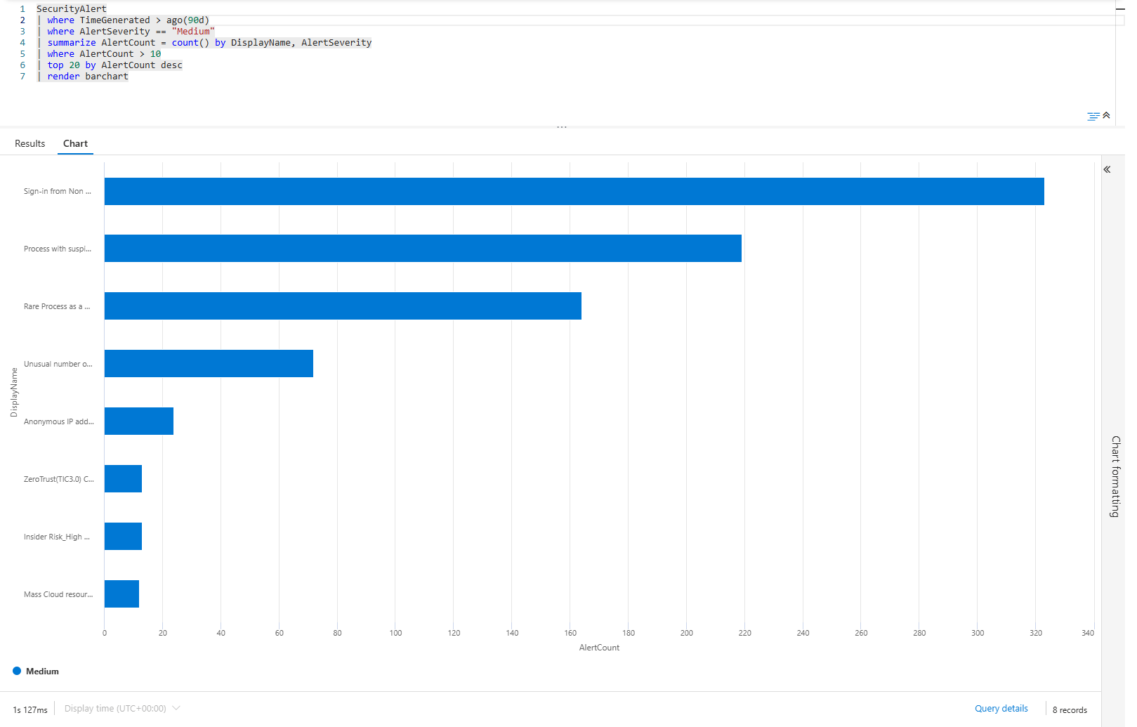 | summarize AlertCount = count() by DisplayName, AlertSeverity