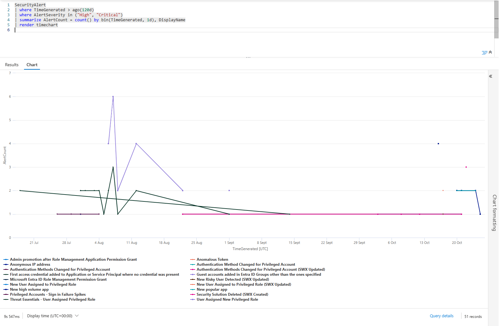 | summarize AlertCount = count() by bin(TimeGenerated, 1d), DisplayName