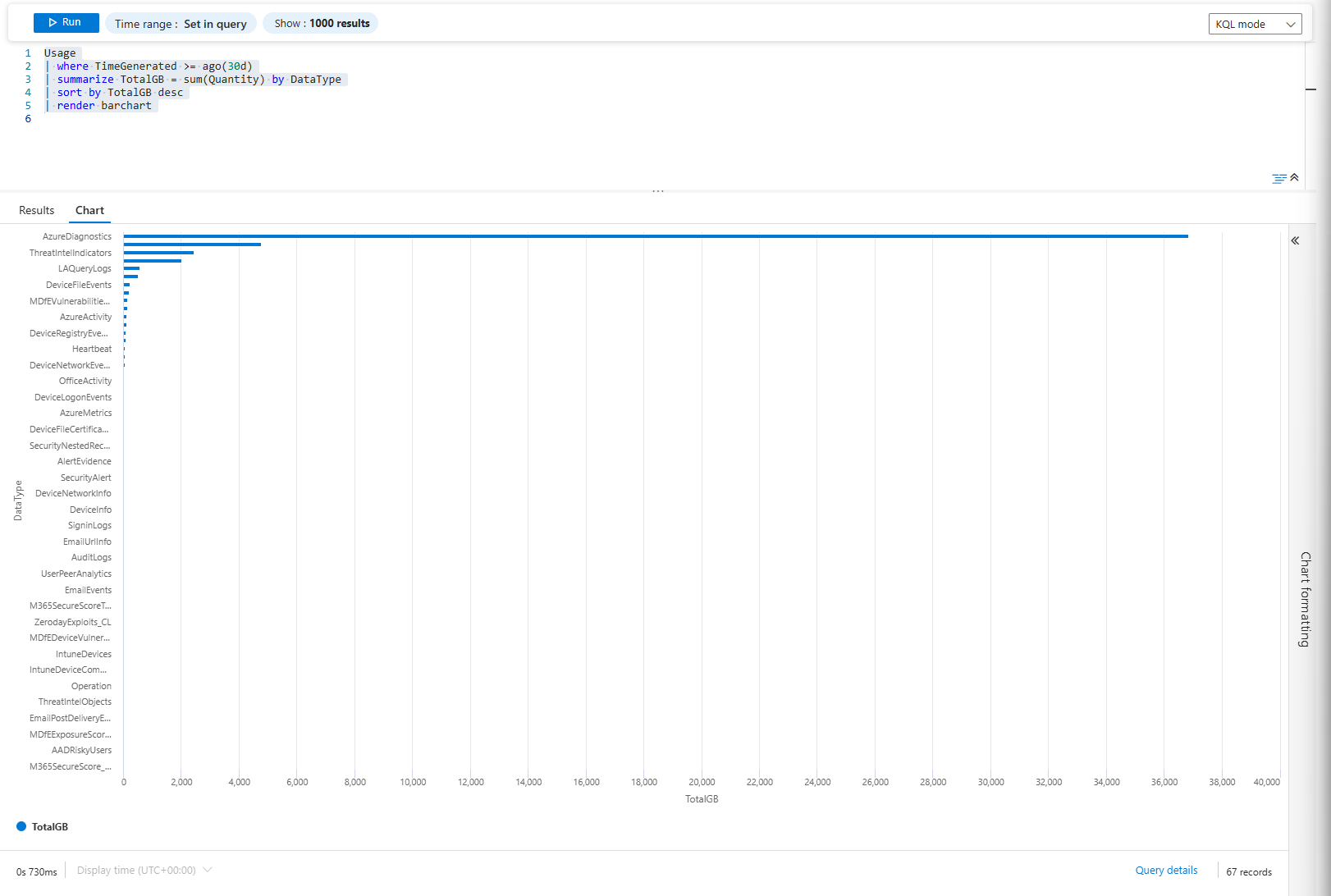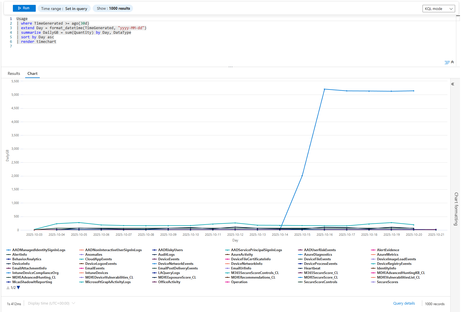 Each line is a data source over time. If AzureDiagnostics went from 20GB/day to 80GB/day, something is generating extra events. New Storage Accounts added? New Firewall? The chart shows when it happened. Then you investigate.