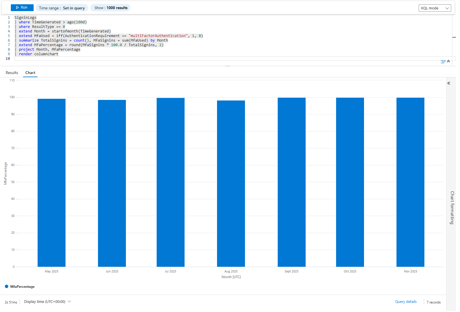 | extend MfaPercentage = round(MfaSignins * 100.0 / TotalSignins, 2)