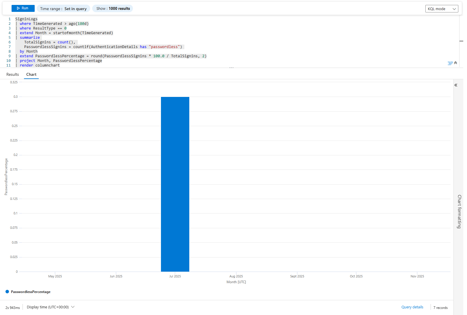 | extend PasswordlessPercentage = round(PasswordlessSignins * 100.0 / TotalSignins, 2)