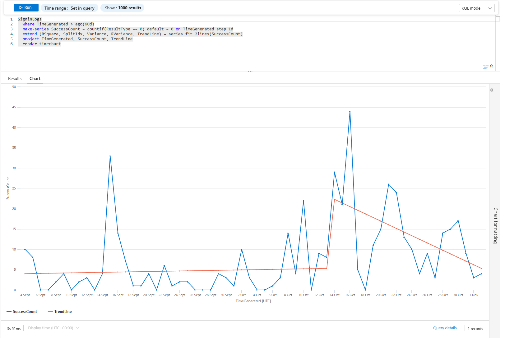 | render timechartThis query builds a line chart with the actual sign-in count (blue line) and a fitted trend line (orange). The trend line shows the real direction. If it's climbing, your environment is getting healthier. If it's flatlining, then dropping hard at the end, something broke last week.