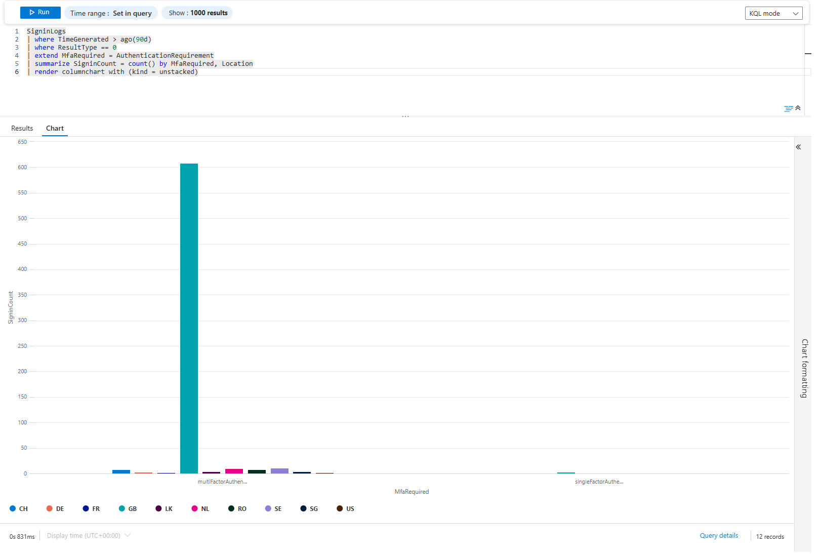 Unstacked columns show each authentication requirement side-by-side for each location. If London has 80% single-factor and 20% MFA, your conditional access policy isn't working there. If New York is 5% single-factor and 95% MFA, it's working.