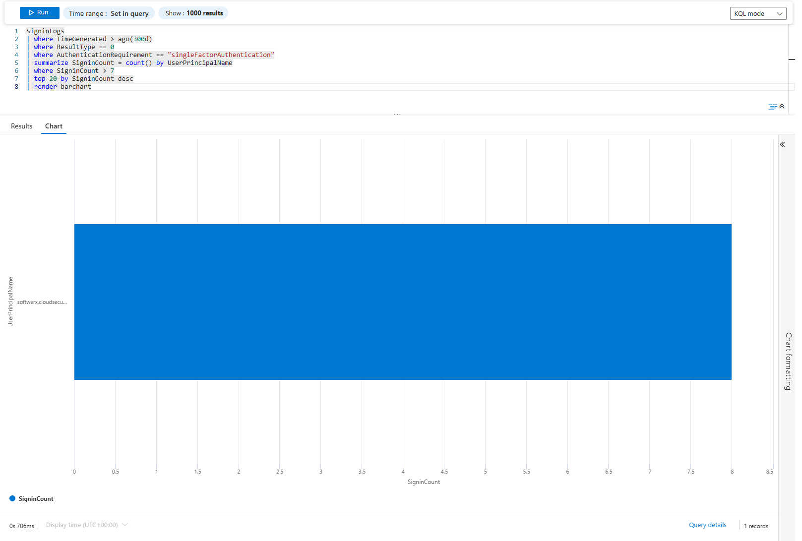 Bar chart of users still using single-factor. These are your targets for the next MFA push, or to check which applications exactly are using single-factor. If half the C-suite is here, that's your political problem. If it's test accounts and service identities, ignore them.