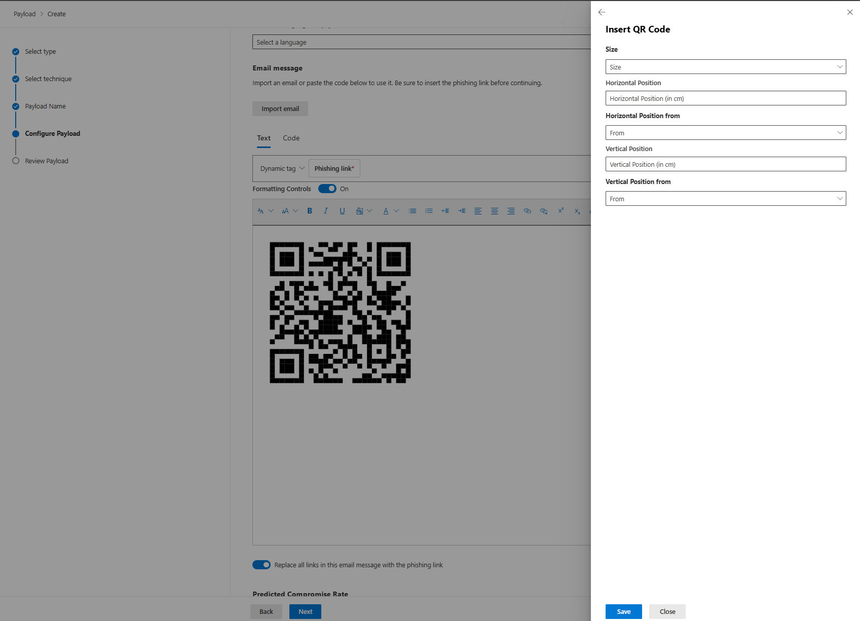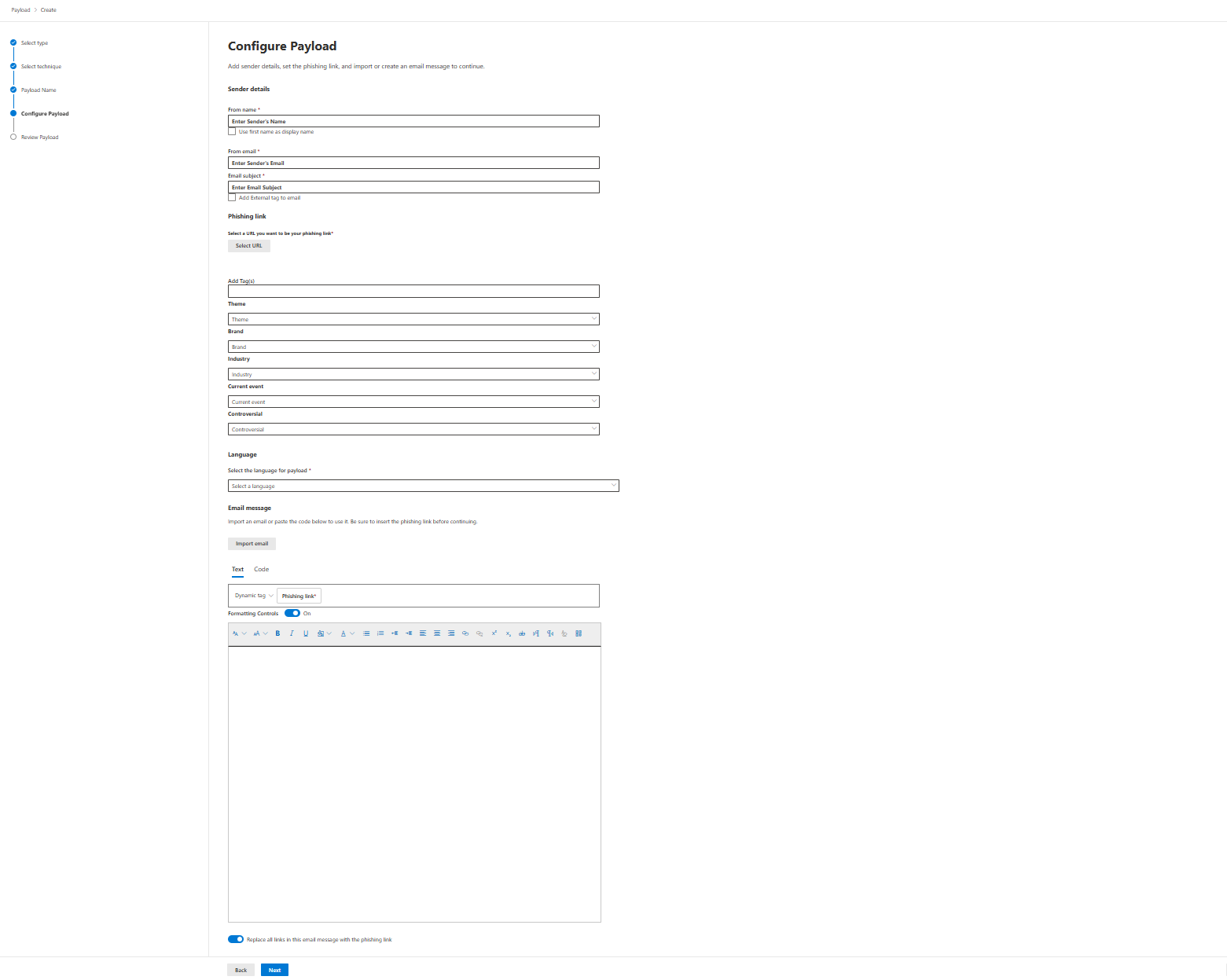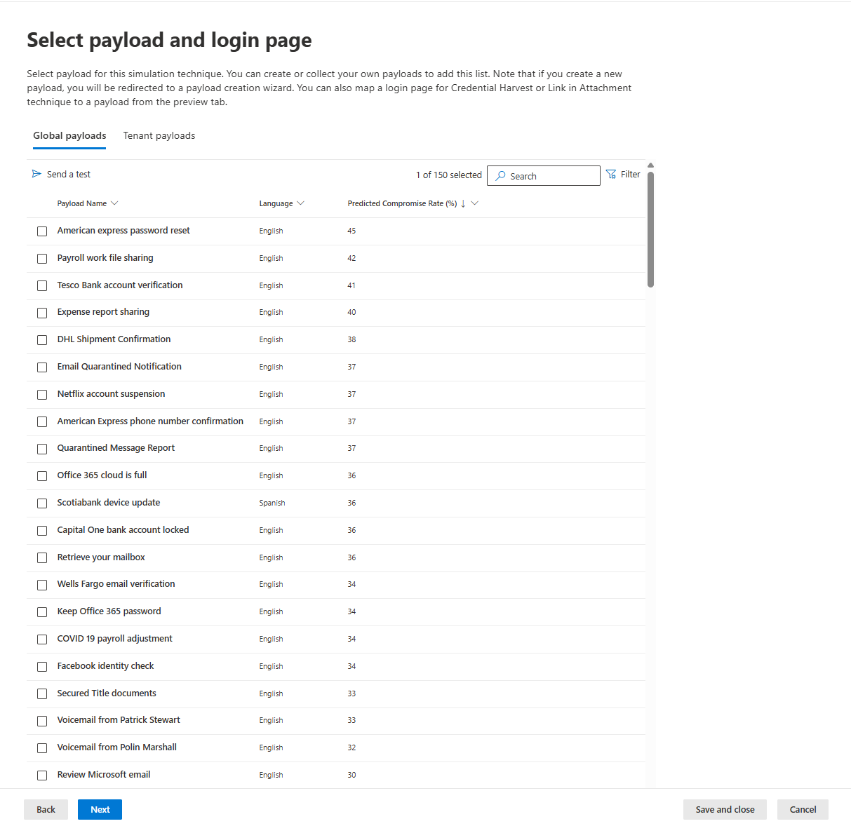 Each payload has a Predicted Compromise Rate (PCR). This is statistical modelling based on historical data from Microsoft 365. It tells you what percentage of users will likely fall for it based on aggregated, anonymised data across millions of simulations. PCR is useful for calibrating difficulty. A PCR of 20% means it's moderately believable. 60% plus means that users may have a hard time recognising it (which, of course, depending on what you are trying to achieve, may not be a bad thing)