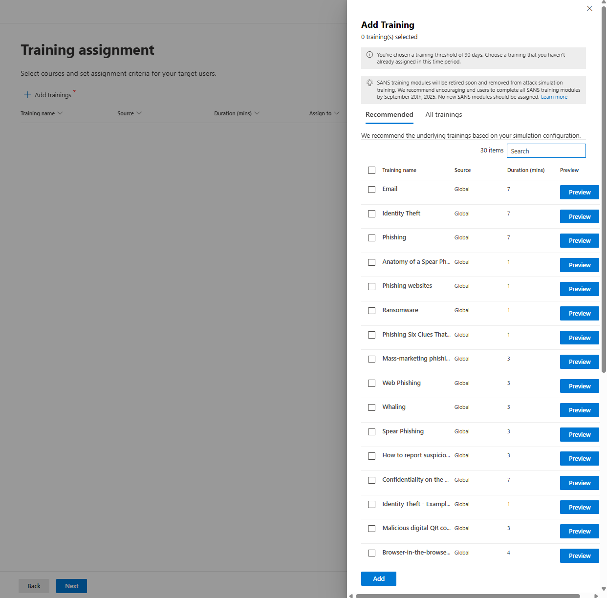 AST lives in the Microsoft Defender portal. No extra console. You can integrate with Microsoft 365 groups and distribution lists, including dynamic groups based on department, hire date, role, or any Azure AD attribute. This is genuinely useful for focused training.