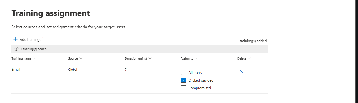 You can assign the training to all users, those who clicked the link or/and are compromised (they actually entered their credentials inside the phishing link)