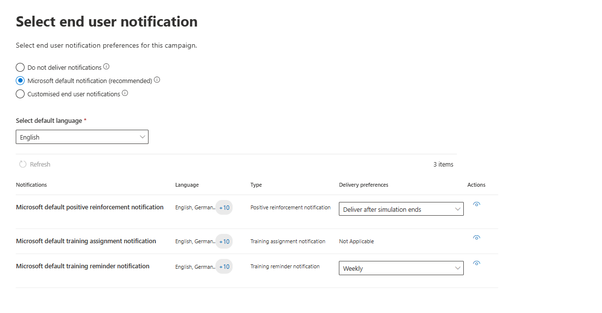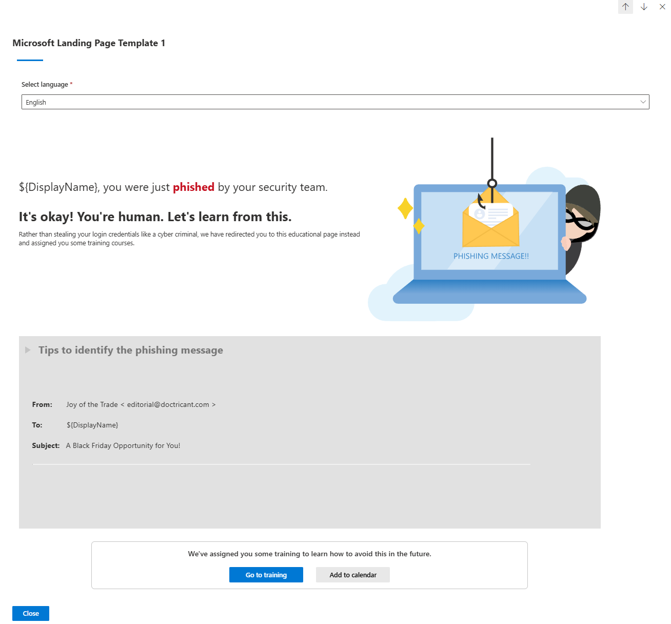 When a user gets caught, they land on a page. Microsoft has templates. You can customise them with your own branding. Or use a custom URL and host your own training elsewhere.