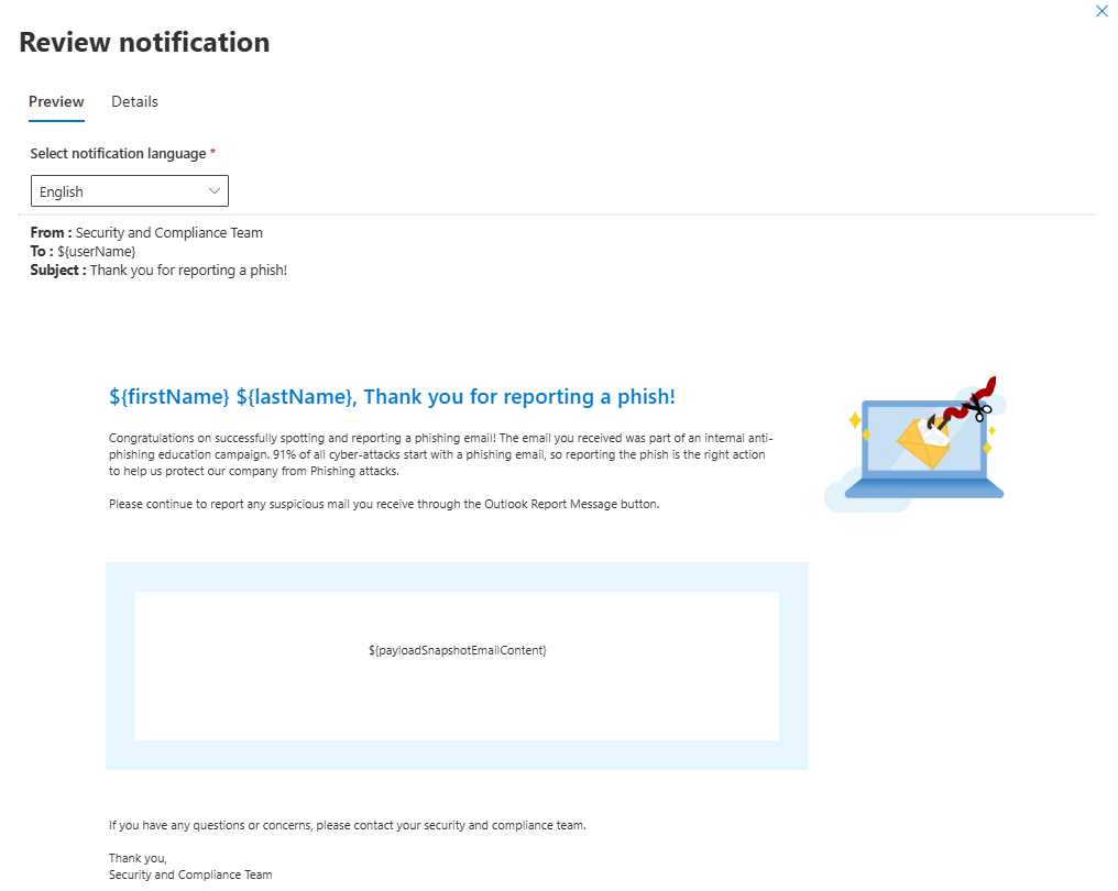 User notification is a great addition to everything above. You can switch between different reminders when a user was phished and add a "Thank you" message when a user reports a message