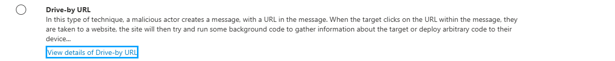 Drive-by URL: Email with a link to a watering-hole attack. Background code attempts to install software or gather information.