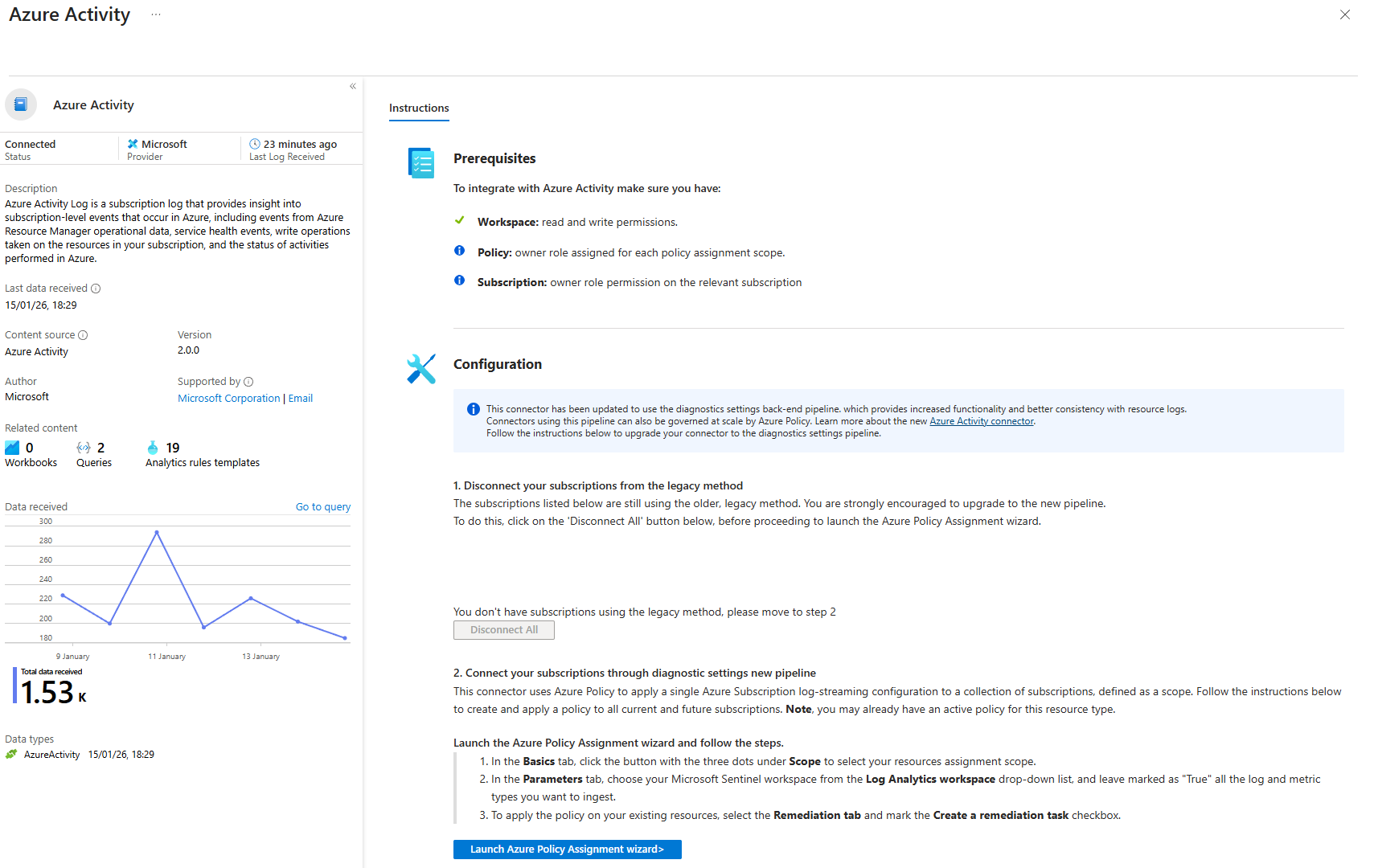- Check diagnostic settings separately: Go to Entra ID portal > Monitoring > Diagnostic Settings, verify the connector's diagnostic setting exists and is enabled
