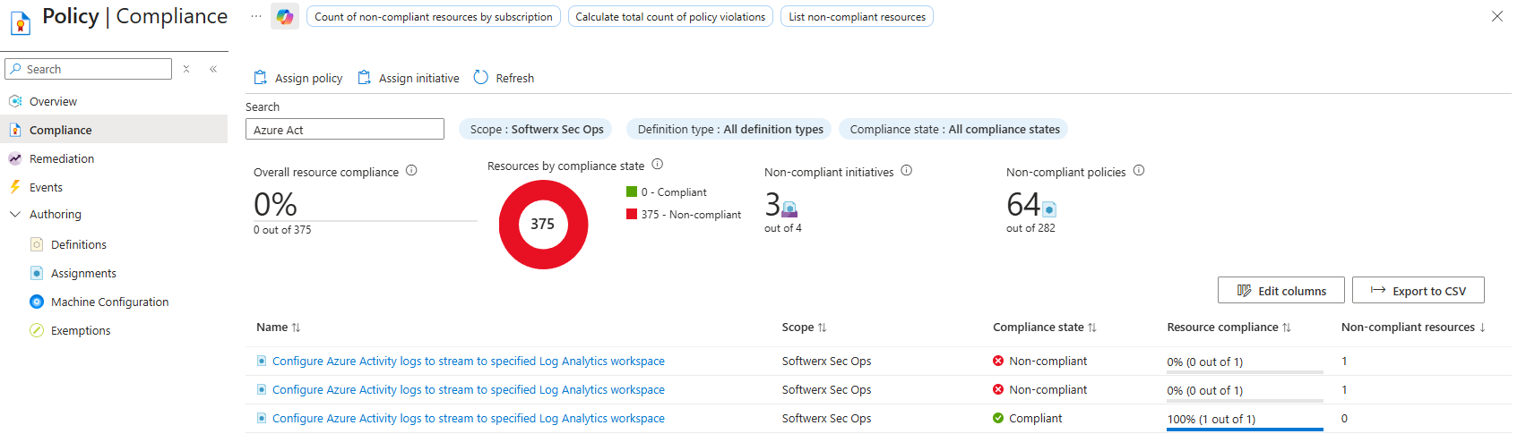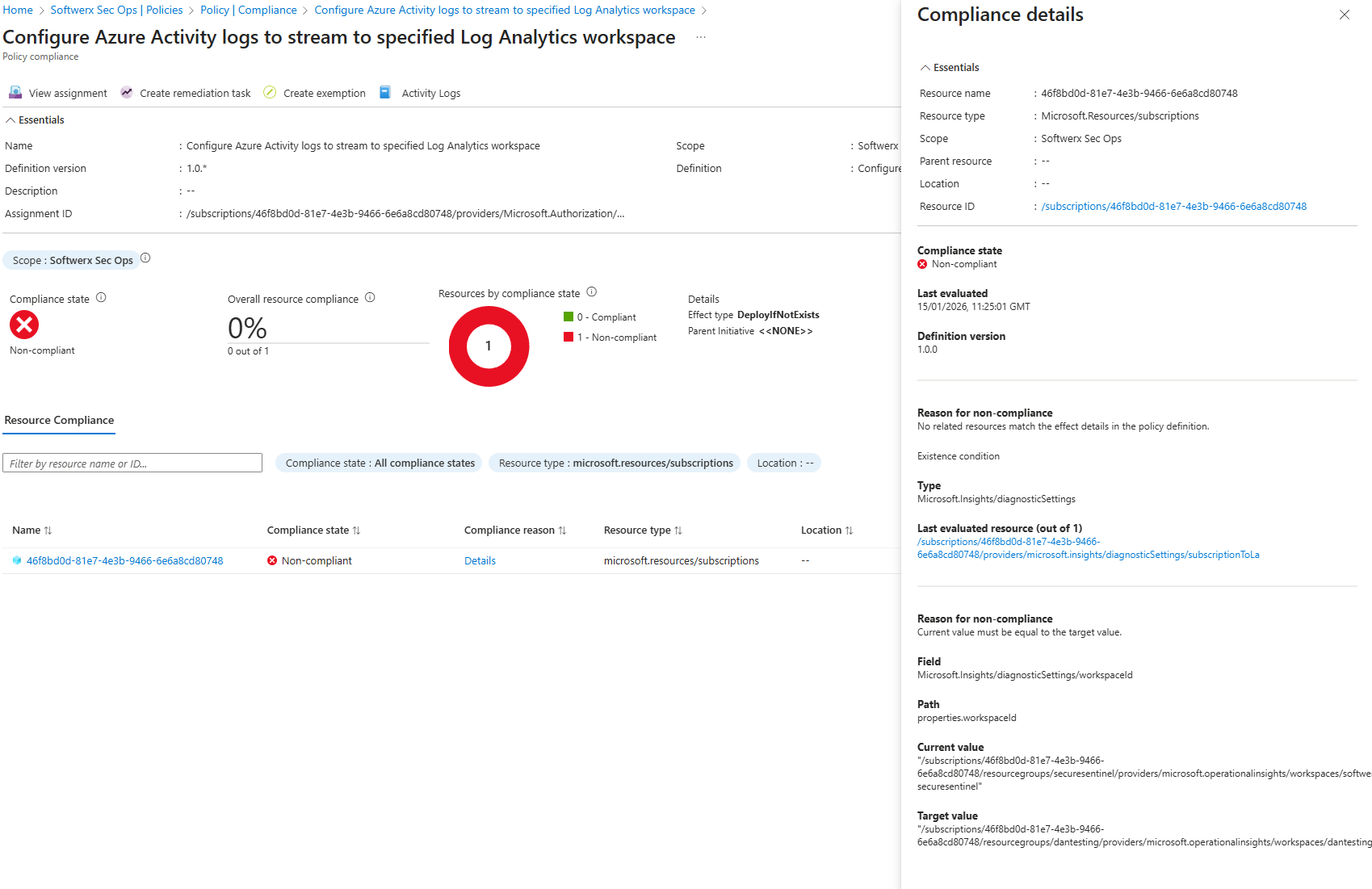 - Policy deployment fails silently. Go to Azure > Subscriptions > your sub > Policies > Compliance. Look for "Azure Activity logs." If it's not "Compliant," the policy didn't apply.