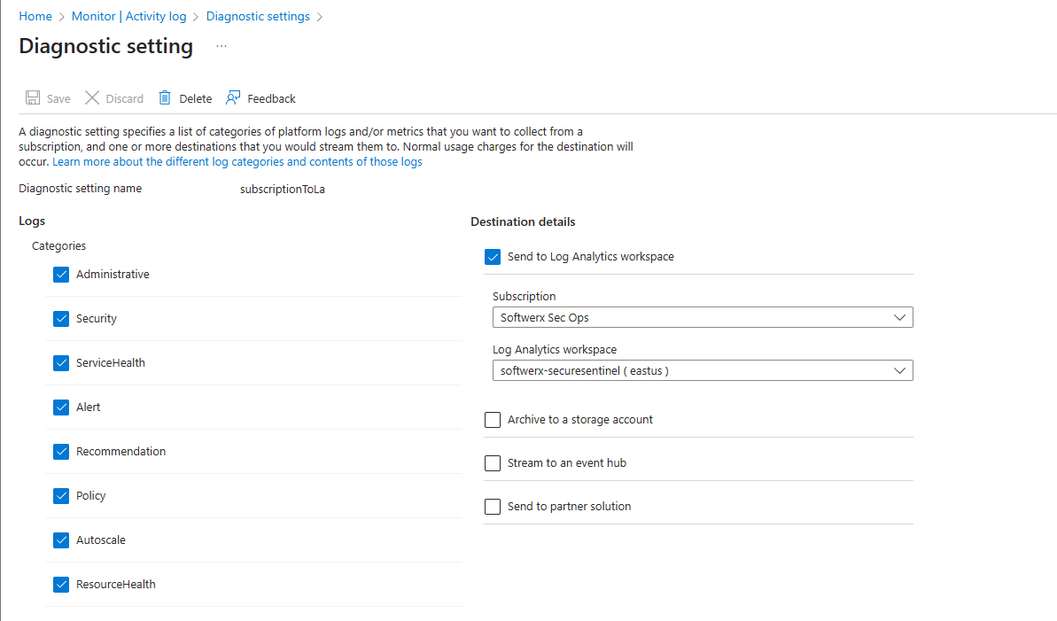- The policy auto-deploys diagnostics settings across all your subscriptions (you need to rerun the policy deployment per subscription)