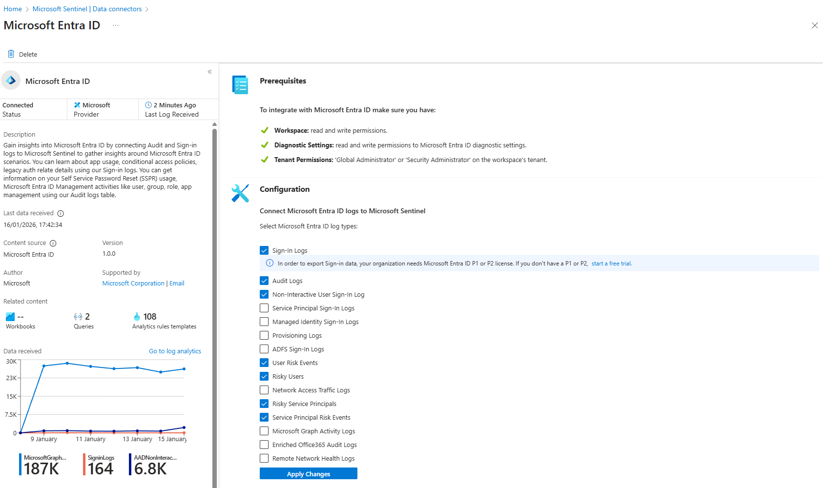- Optionally you can select User Risk Events, Risky Users, Risky Service Principals, and Service Principal Risk Events. Everything else is down to your environment (and whether you are using those additions or not)