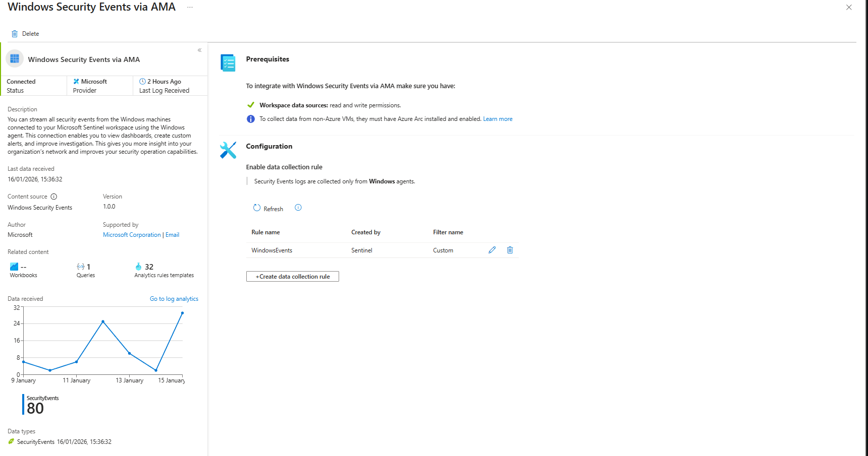 - Sentinel > Data Connectors > "Windows Security Events via AMA"