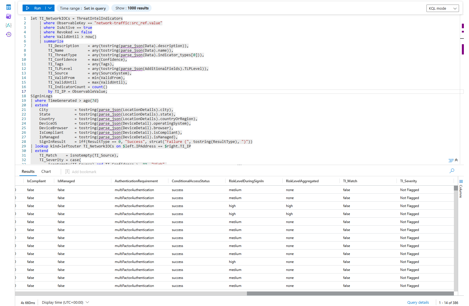 Enrichment can be done really easily by connecting IP addresses seen in the various Analytic Rules to the Microsoft TI (or any other vendors like VirusTotal - though that would be via Logic Application), example below: I am merging the Singinlogs table together with ThreatIntelIndicators to check if I had any logins from addresses listed in the IOCs.